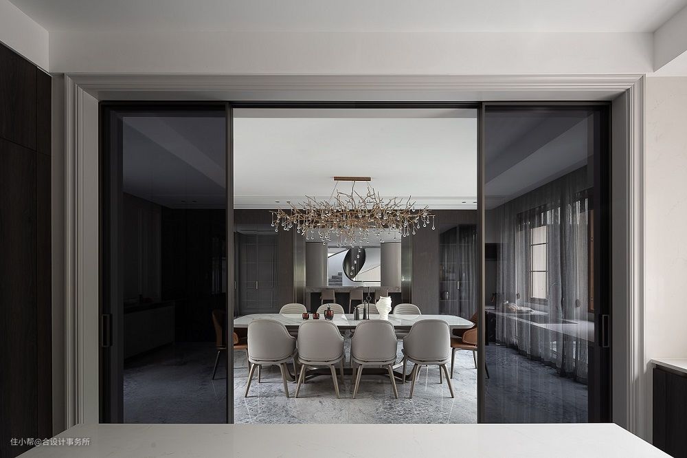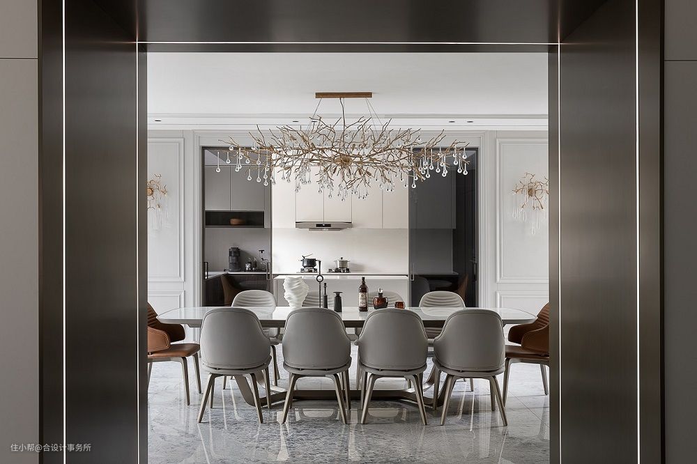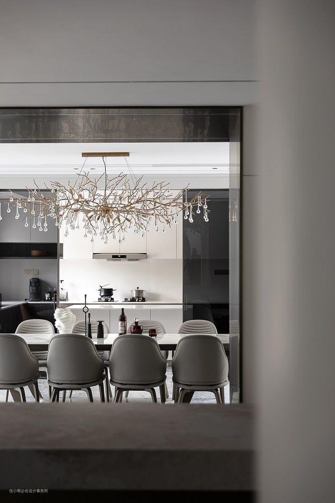 餐厅和厨房用黑色玻璃门隔断,起到一个隔绝油烟的作用,同时还有效划分了功能区。 餐选用岩板西餐长餐桌,岩板纹理花色变幻莫测,把酒言欢间尽显奢华大气,十把皮质餐椅足够家庭聚会使用。 餐桌顶部的鹿角水晶吊灯大概是餐厅区域最吸睛的装饰了,佐以简约的餐桌椅,将整体空间显得格调高雅又不繁琐。 #餐厅 #餐厅设计