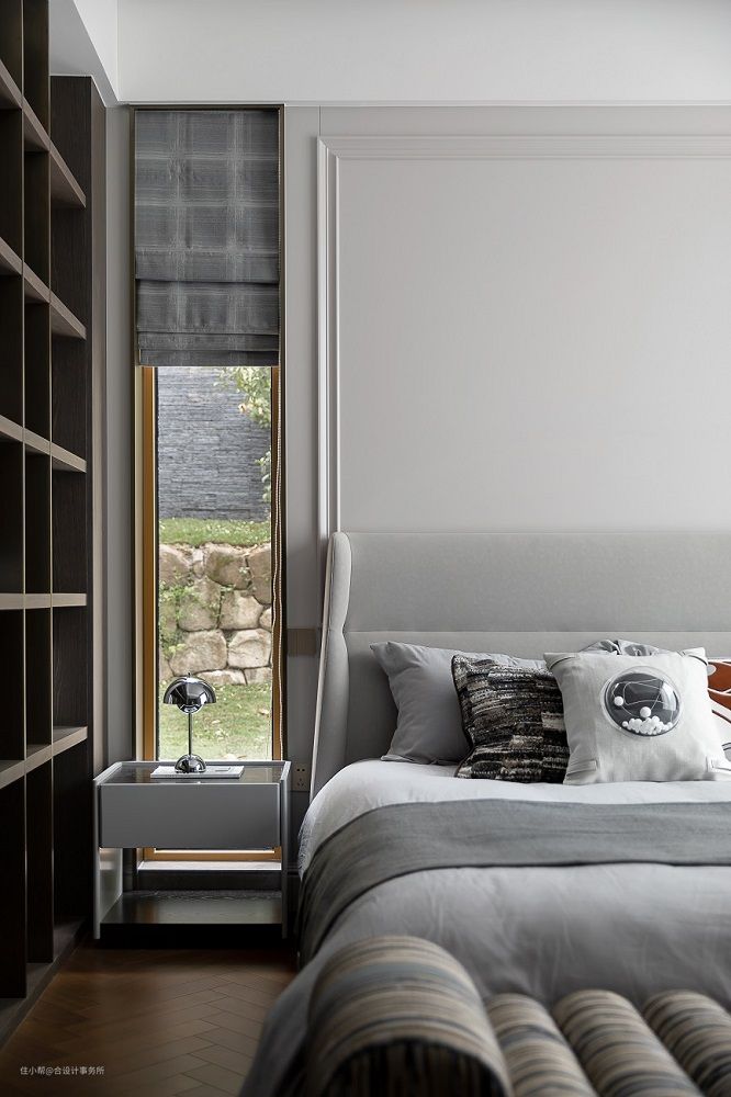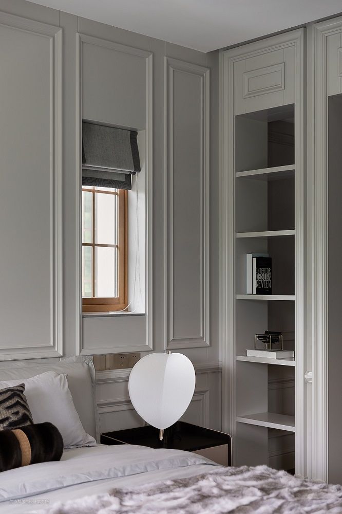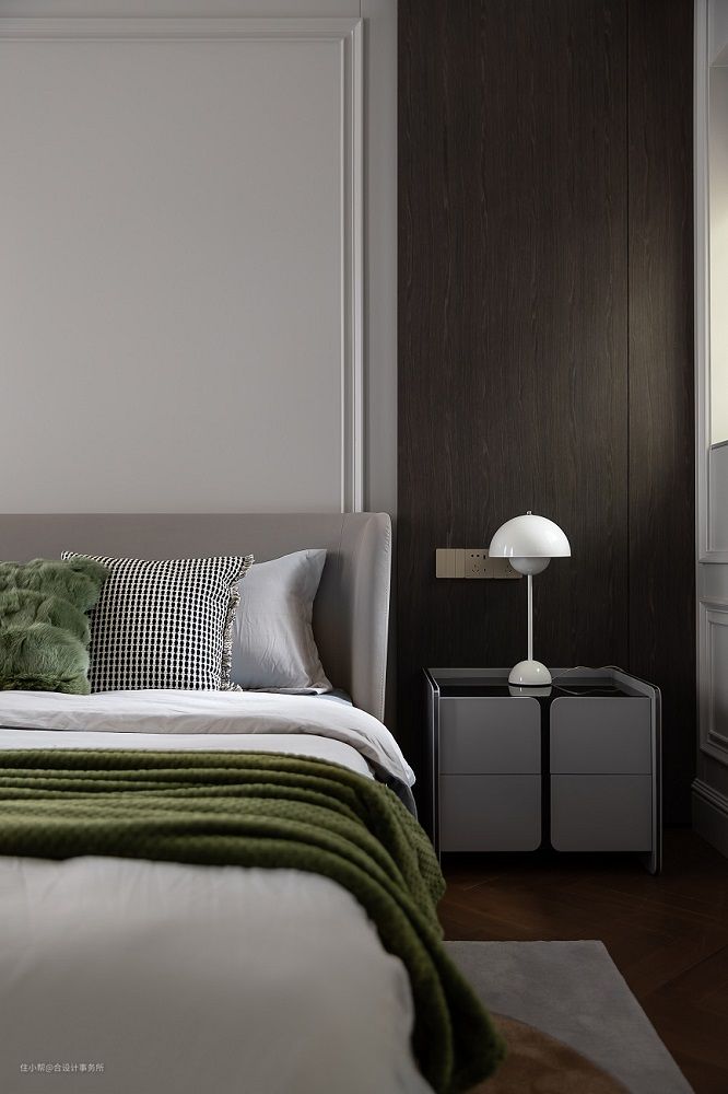 次卧延续整个空间的设计风格,墙壁采用石膏线装饰,看起来干净统一。床头柜一处用胡桃木板面上墙,为卧室增加一份静谧,营造一个舒适沉稳的睡眠空间。