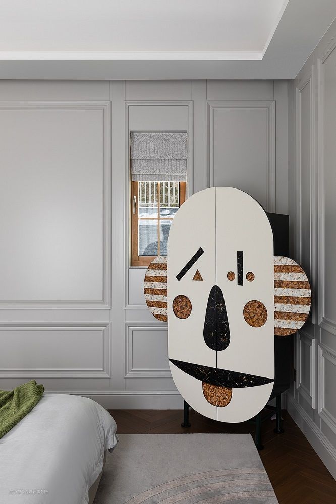 床脚摆放一个小丑笑脸落地装饰品,简单明朗的色调,充满设计感与调性,打造时尚简约、自然舒适的风格。 #次卧 #设计