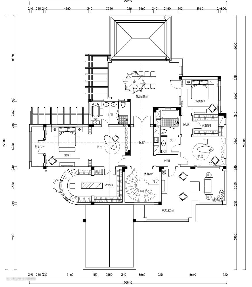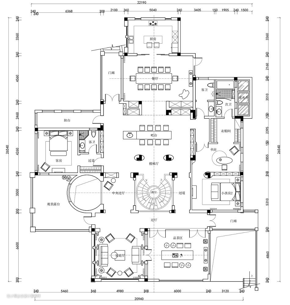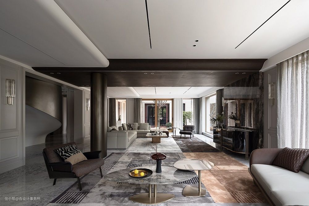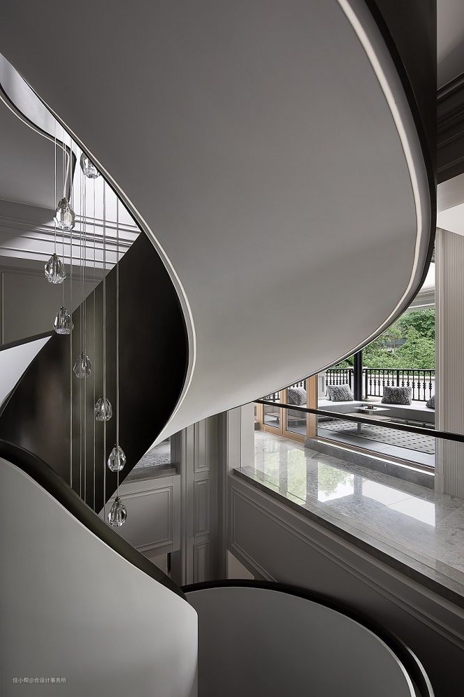 将圆弧楼梯安置在了入户玄关后,整个建筑都是围绕着楼梯的形势进行发散式分布,不管身处哪个位置,这个楼梯都将会是这房子的灵魂所在,将楼梯真正做成了一处景。