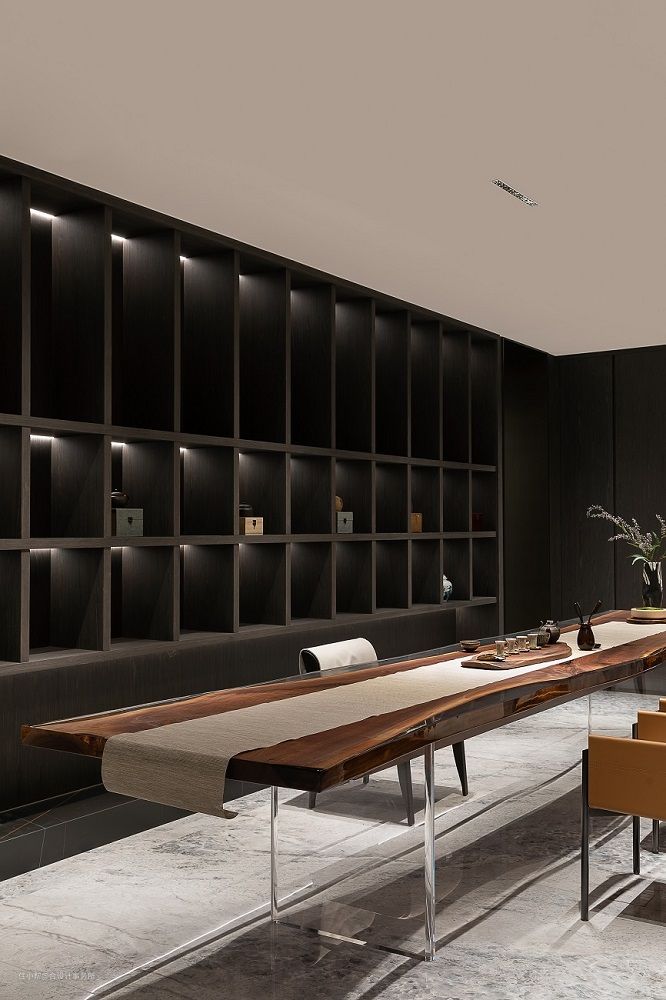 黑胡桃木的温润质感为茶室带来了古色古香的风味,自然形成的纹理如同不可复制的画卷,触之温润舒适,让人在此尽享雅致生活。 #茶室 #设计