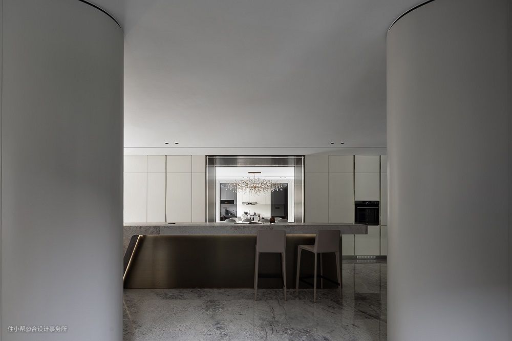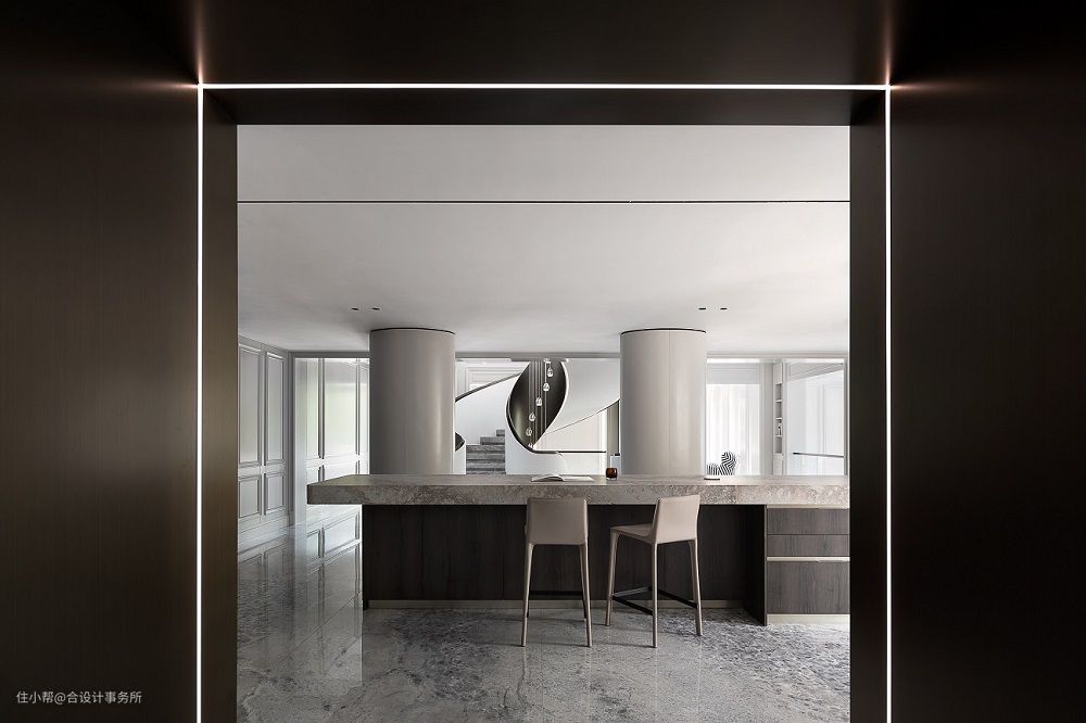 一字型岩板吧台与空间硬装风格保持一致,放在楼梯一旁,通过与楼梯、餐厅、厨房等空间的连通,创造了更宽裕的家庭欢聚空间。 #吧台 #吧台设计