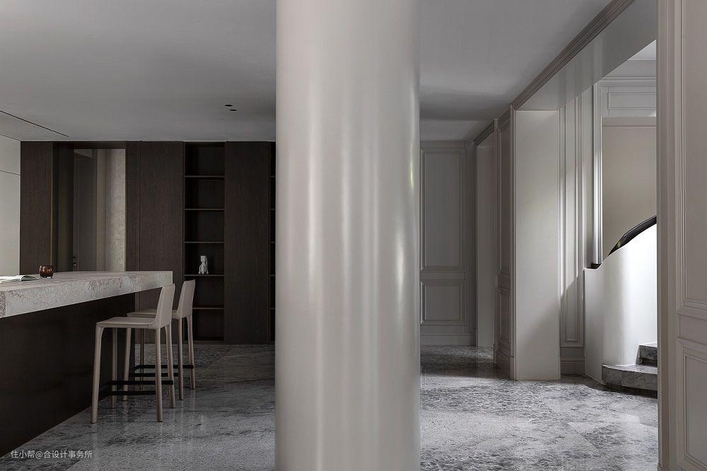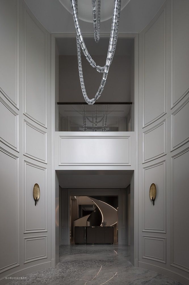 走廊区域采用了挑空设计,增强室内采光的同时显得整个空间高级感满满。空间整体上以白色为主色调,冲淡了大理石带来的冰冷感,色彩的融合让整个空间拥有法式浪漫感。