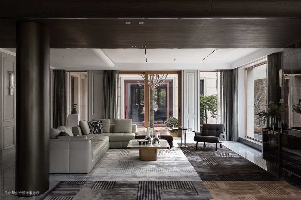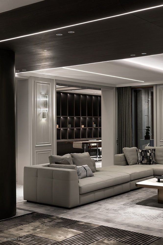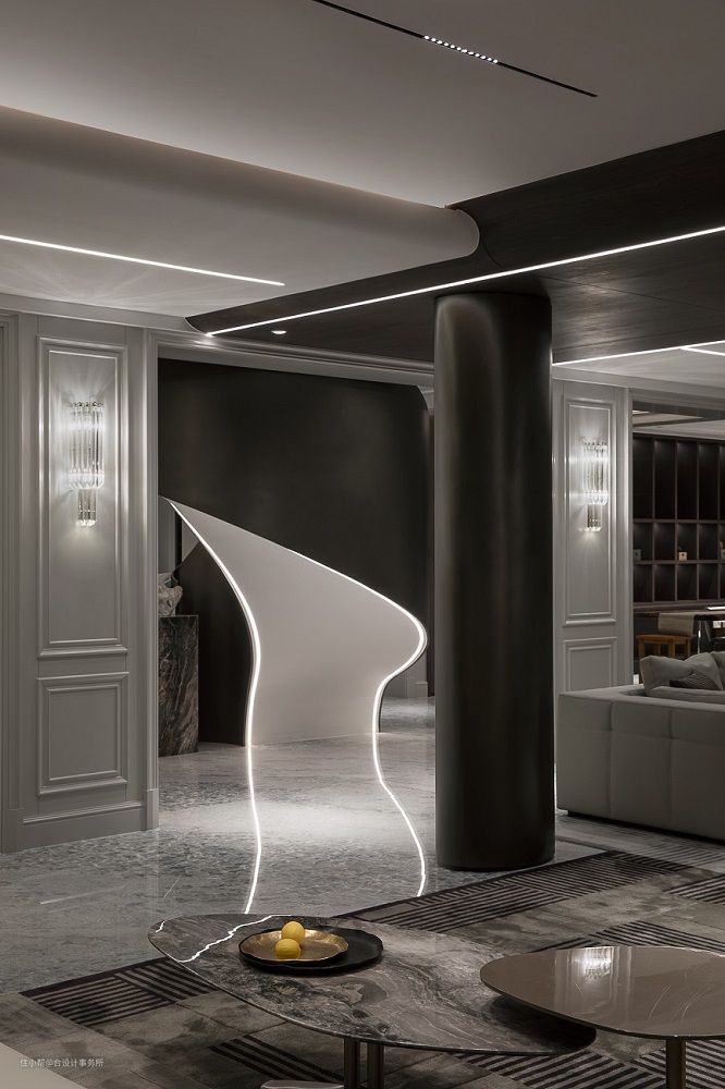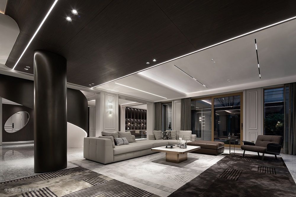 线条简练干净的沙发主体,呈现出点线面的黄金比例,搭配大理石茶几,将卓越的功能性融入其中。 沿着客厅中柱做了一个黑色木饰面的弧形吊顶,巧妙自然的分割出客厅和其他功能区,延伸视野效果,放大空间。 #客厅 #客厅设计