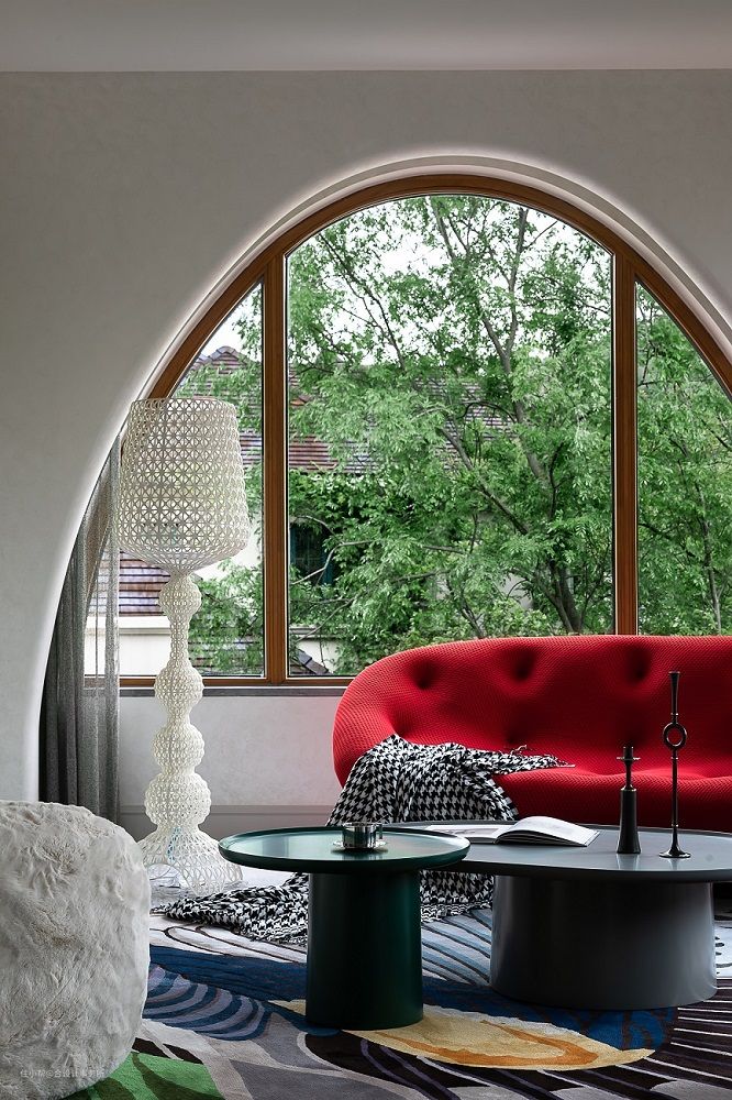 活动区整体氛围充满活力感,四周搭配拱形落地窗,烘托出古典的氛围。弧形的线条在空间中若隐若现,为活动区增添不少温柔,窗外的光影交叠,映射到室内,变成了娴静与温柔。