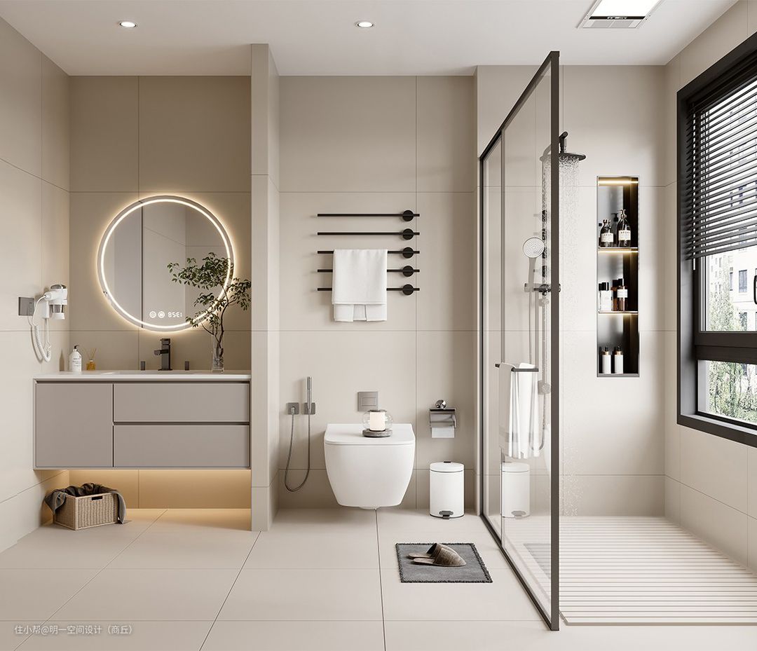 卫生间的干湿分离是一种现代化的设计理念,将卫生间的洗浴区和马桶区分开,以提高使用的舒适度和卫生性。干湿分离可以有效减少湿润环境对整个卫生间的影响,如减少水汽和水滴对马桶和洗手台的侵蚀,减少潮湿环境对木制家具和镜子的影响等,保持卫生间的干燥和清洁。