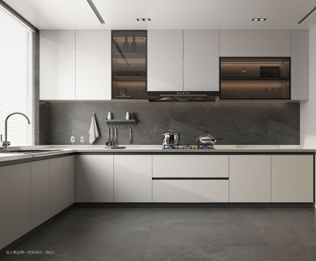 采用中性色调营造出干净、整洁的氛围。橱柜采用平滑的表面和简单的线条设计,强调简洁和现代感。大面积的台面空间,以增加操作的便利性和工作区域的舒适度。