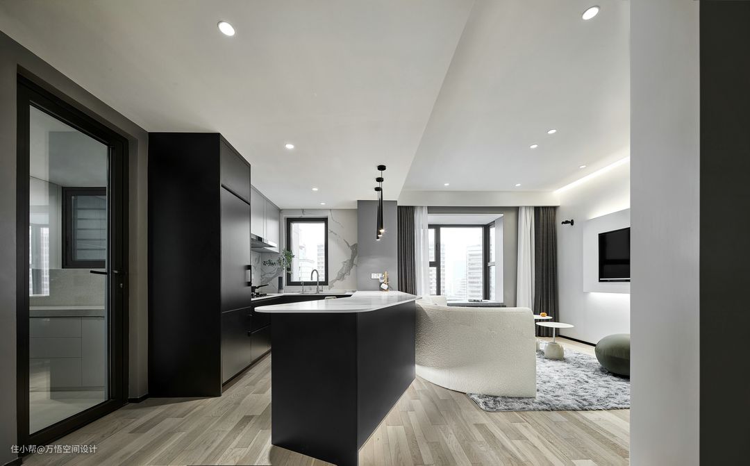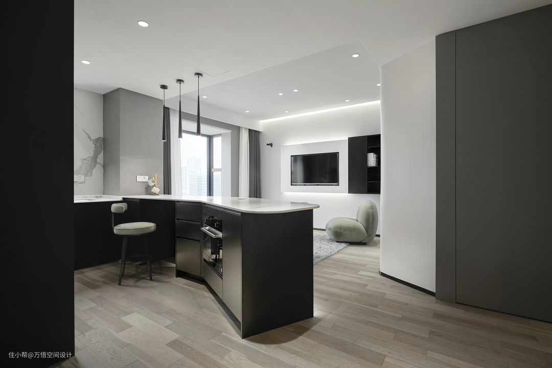 整体色调以黑色为主的经典黑白配,自然纹理的大理石搭配黑色柜体和吧椅,满满的高级质感!