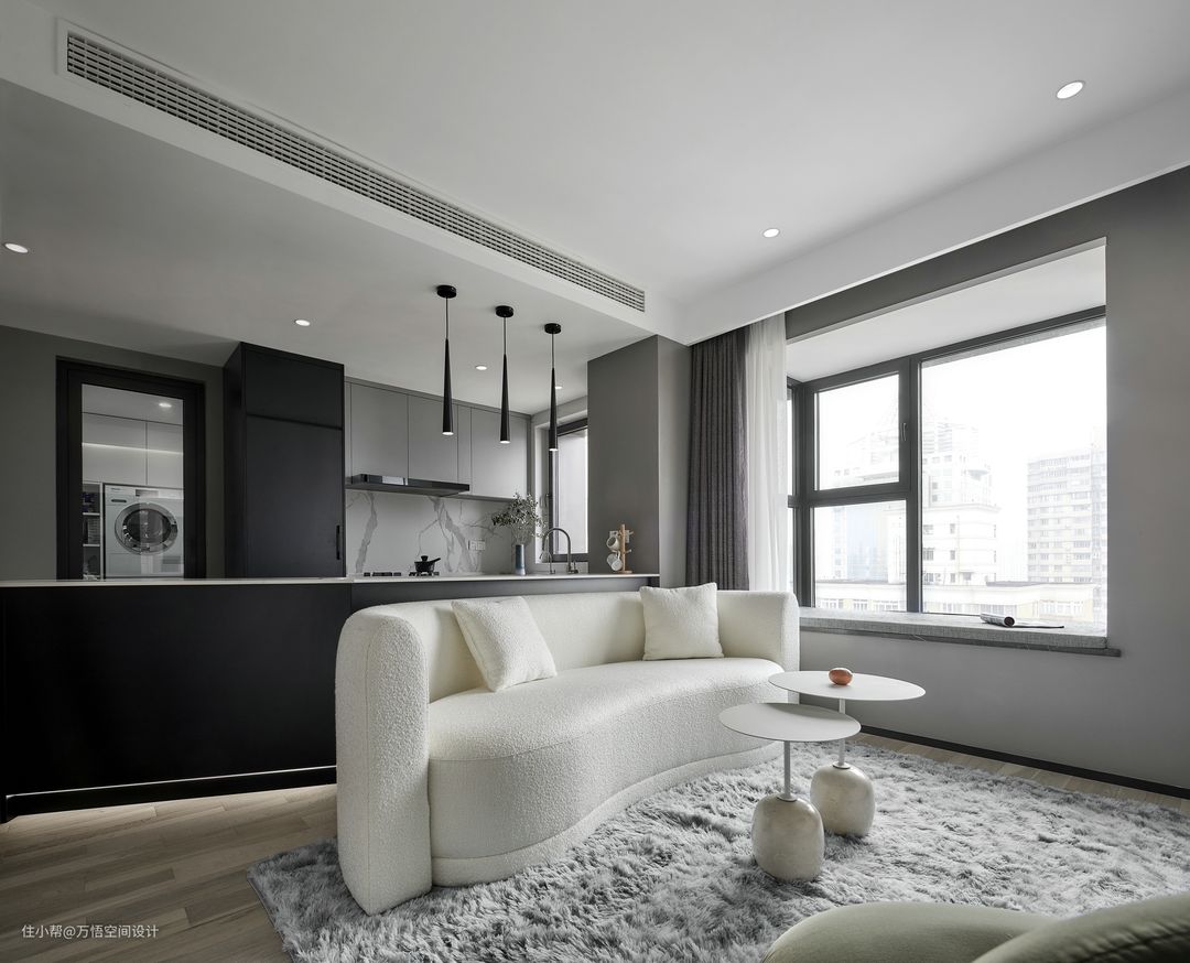 整个空间以黑白灰为主题,加入暖色光源营造温馨感;