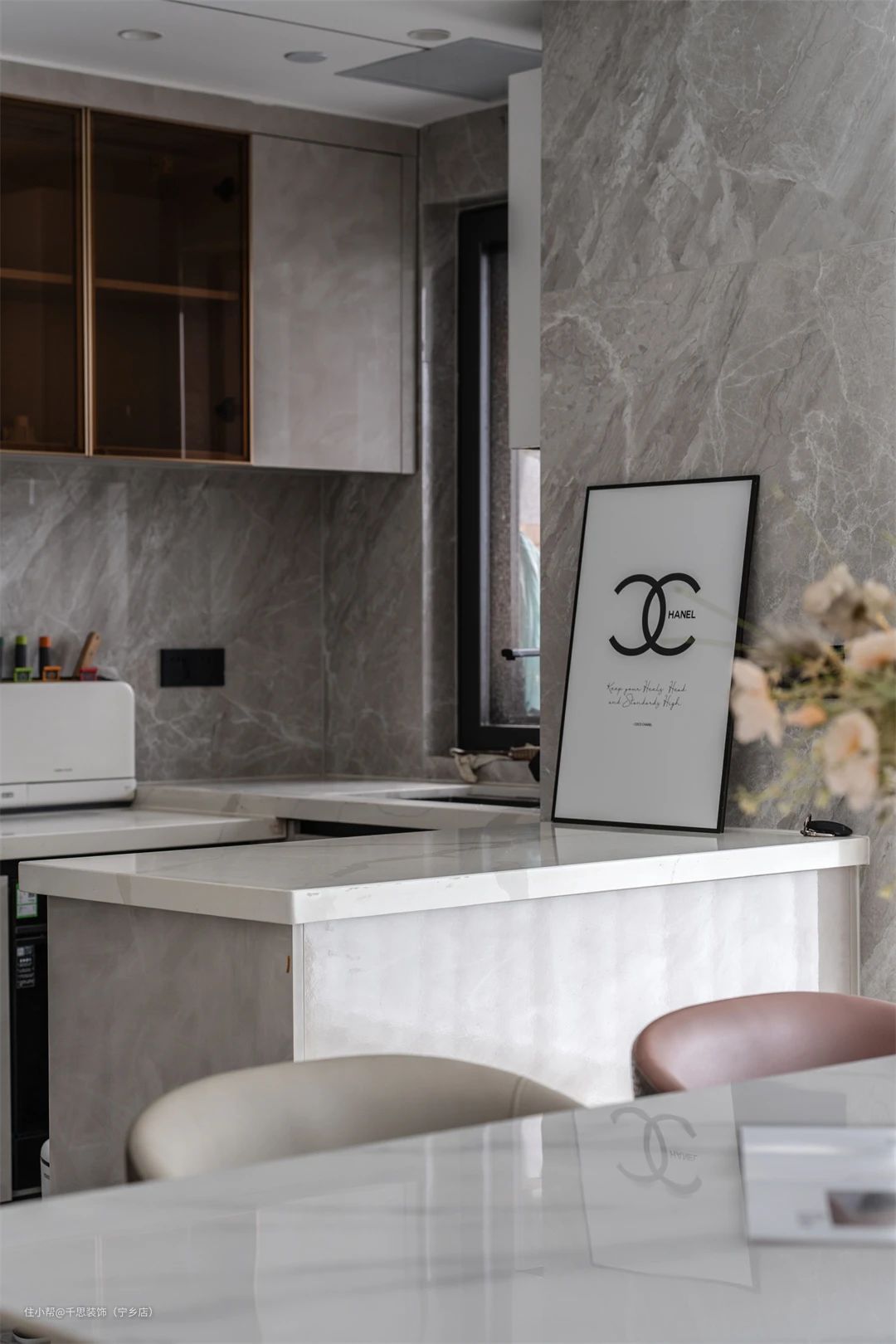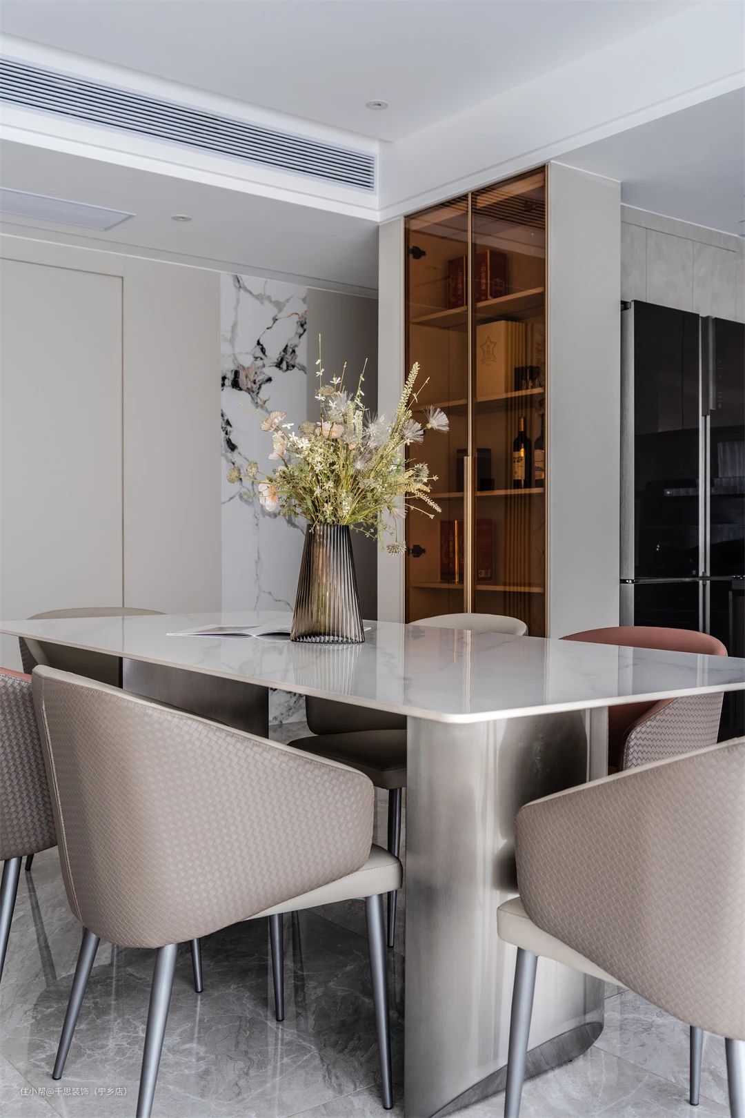 ▲ 餐厅,灰粉色调的皮质餐椅,优雅而时尚,带着细腻的纹路,辅以清新的花束点缀,打造浪漫舒适的质感空间,营造愉悦的就餐氛围。