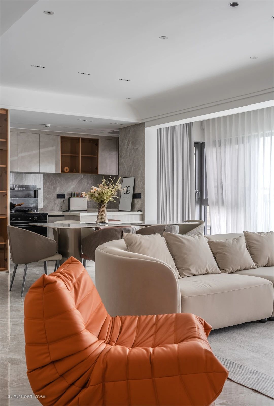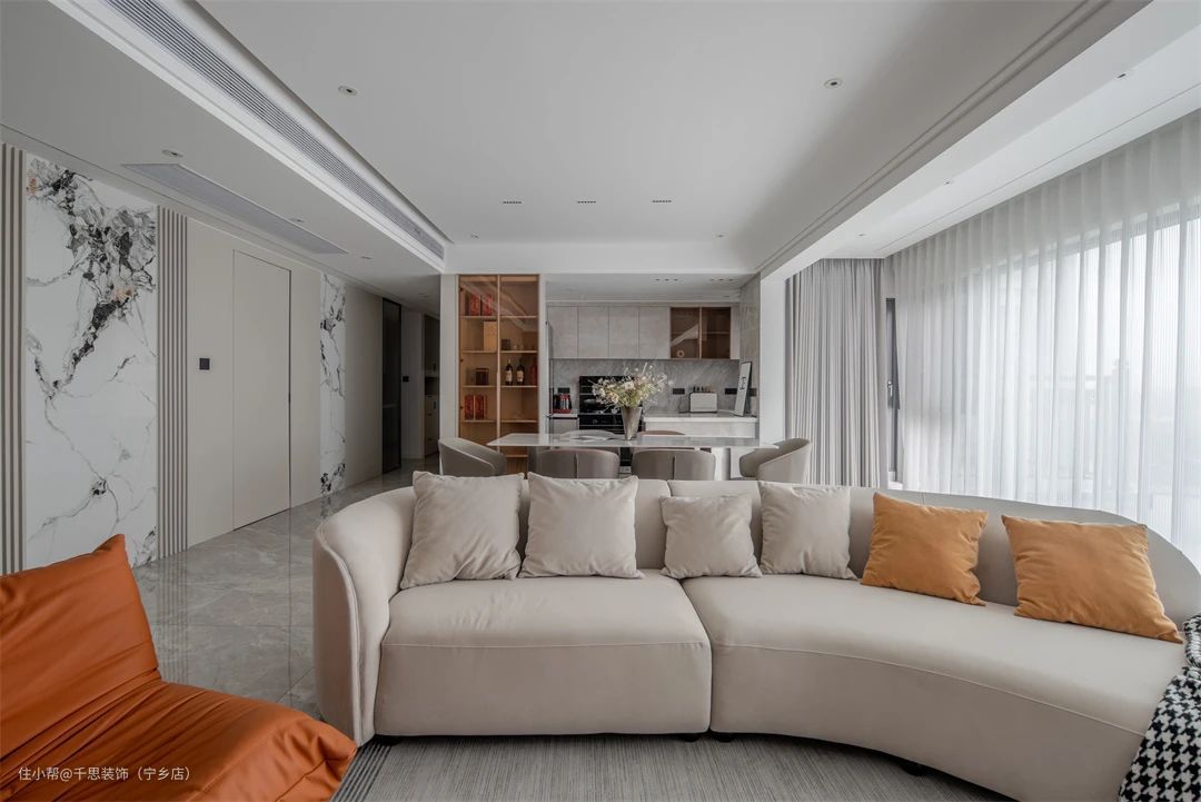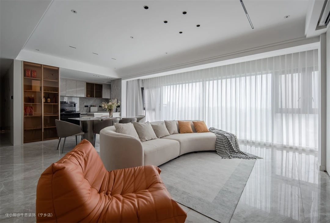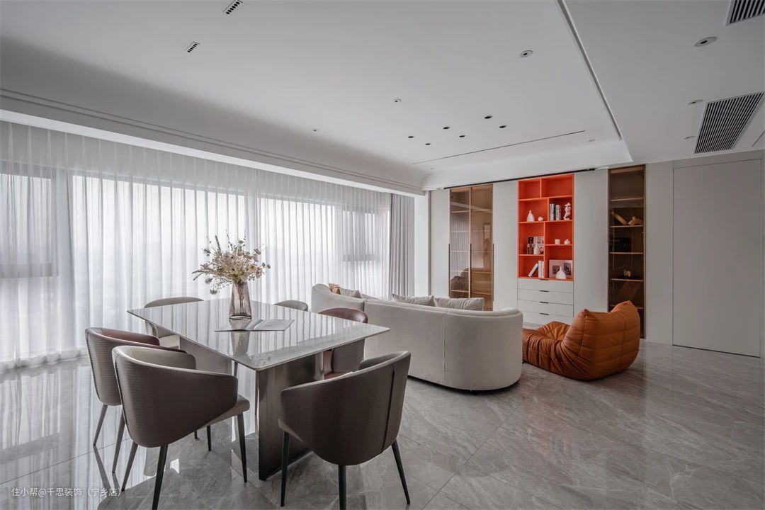 ▲ 客餐厅一体的开放式设计,纳入超大阳台,定制大块的观景玻璃,明媚而柔和的光线通过梦幻帘散至空间每一个角落,暖意缓缓蔓延。