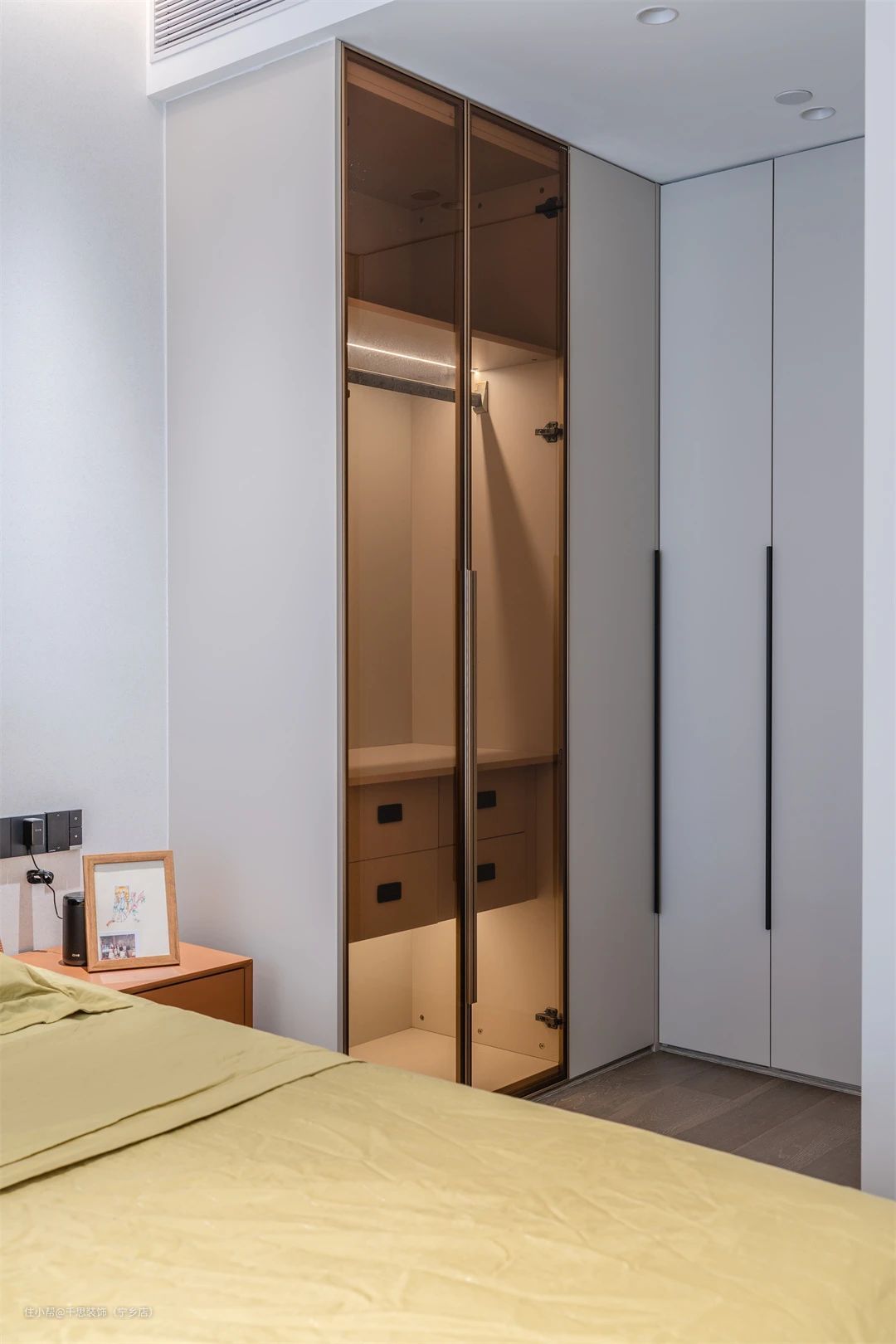 ▲ 大白墙的设计简洁大方,边顶上留出氛围灯带,辅以山丘灯照明,提升空间整体格调。借用床侧的空间,规划小型的围合式衣帽间,补充收纳能力。一门到顶的封闭柜体+黑玻展示柜组合设计,满足屋主对于实用的功能诉求。
