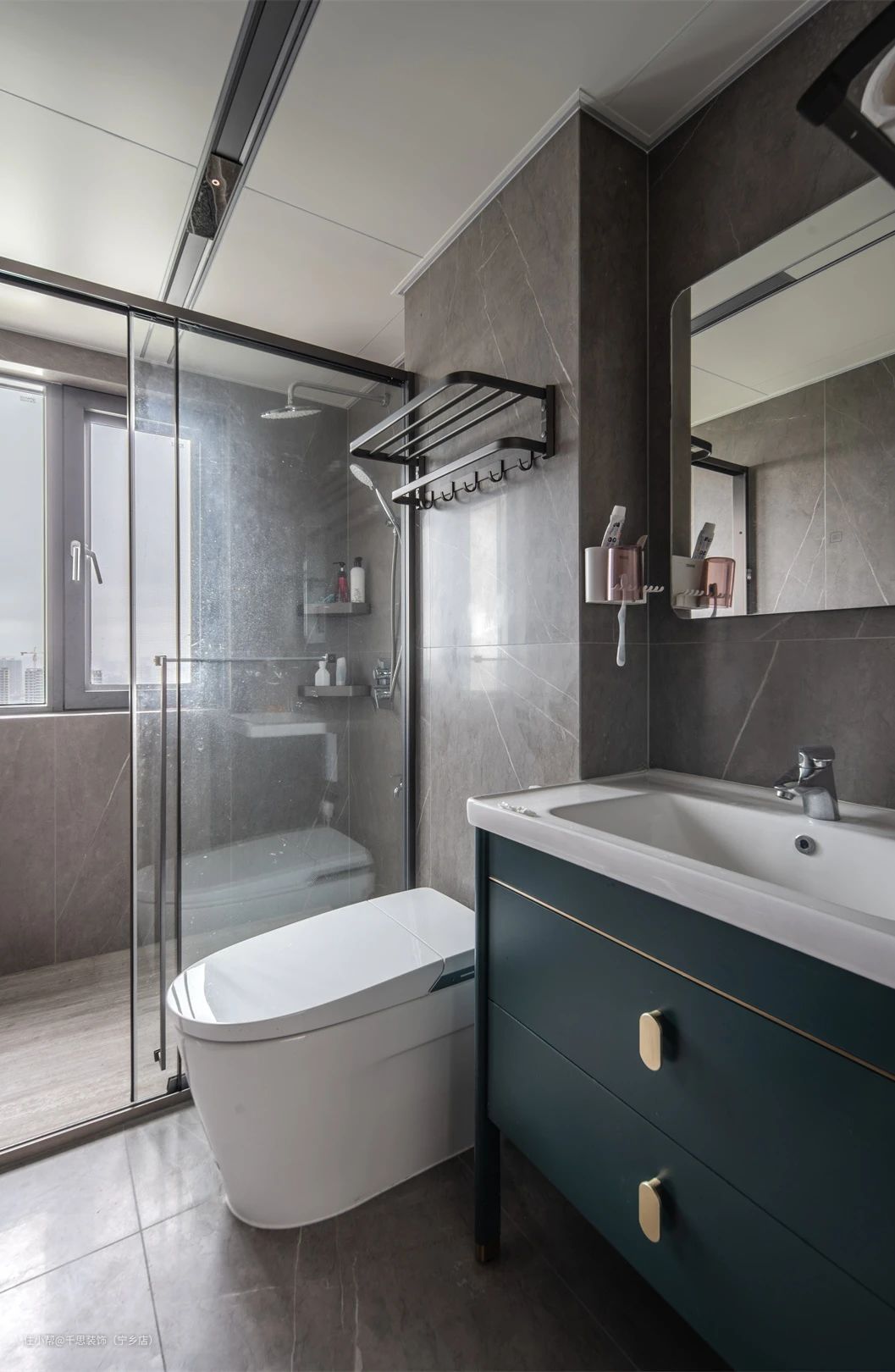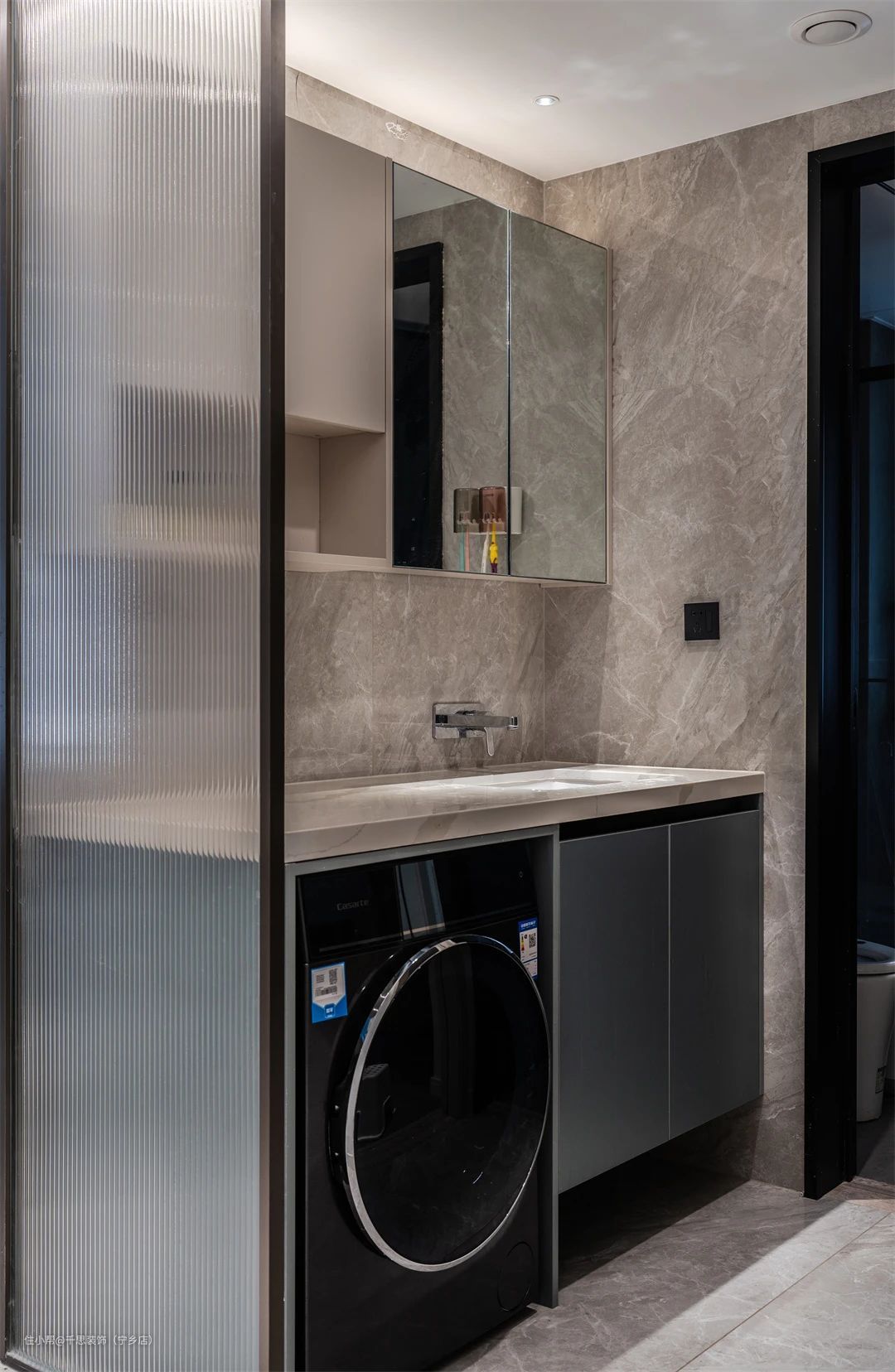 ▲ 卫生间延续整体风格,用色清冷简洁。主卫淋浴区采用玻璃隔断,使得室内光线自然流转。次卫干区外移,以长虹玻璃代替原始墙体。