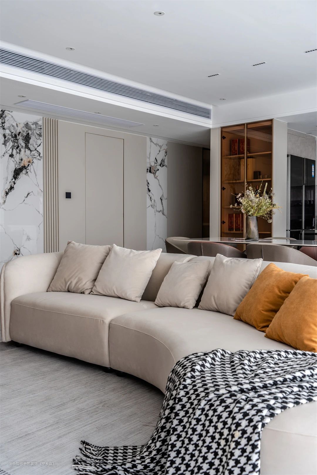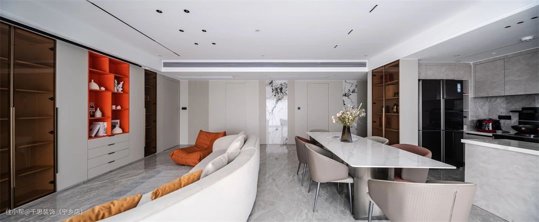 ▲ 挑选带有自然弧度的米色沙发占据公区c位,色彩简约耐看+材质温润柔软,舒适性满分。顶面无主灯设计一路铺陈,提升通透性。电视墙整面储物柜设计,拓展公区的收纳能力。柜体上方暗藏投影代替,收放自如,满足屋主一家大屏观影的需求,保证空间的整齐性。