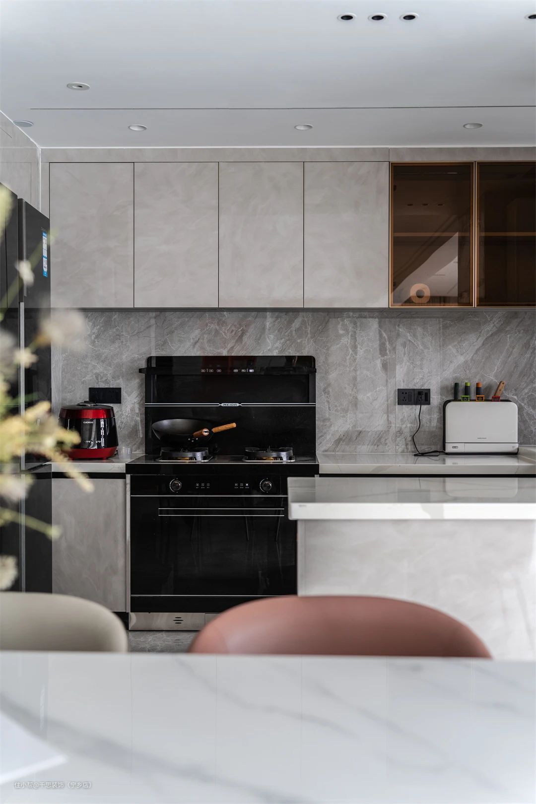 ▲ 厨房依托岛台,形成u型布局。墙地一体设计铺贴灰色瓷砖,打在清爽干净的烹饪环境。天花板同样做蜂窝大板吊顶+无主灯设计。