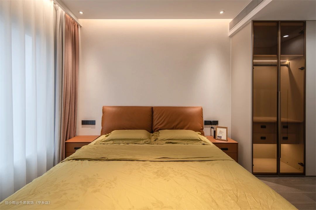 ▲ 次卧整体设计简洁朴素,但选择焦糖色床头搭配复古色调的床品,深与浅的碰撞间,散发着丝丝暖意,赋予空间浓郁丰富的感染力。