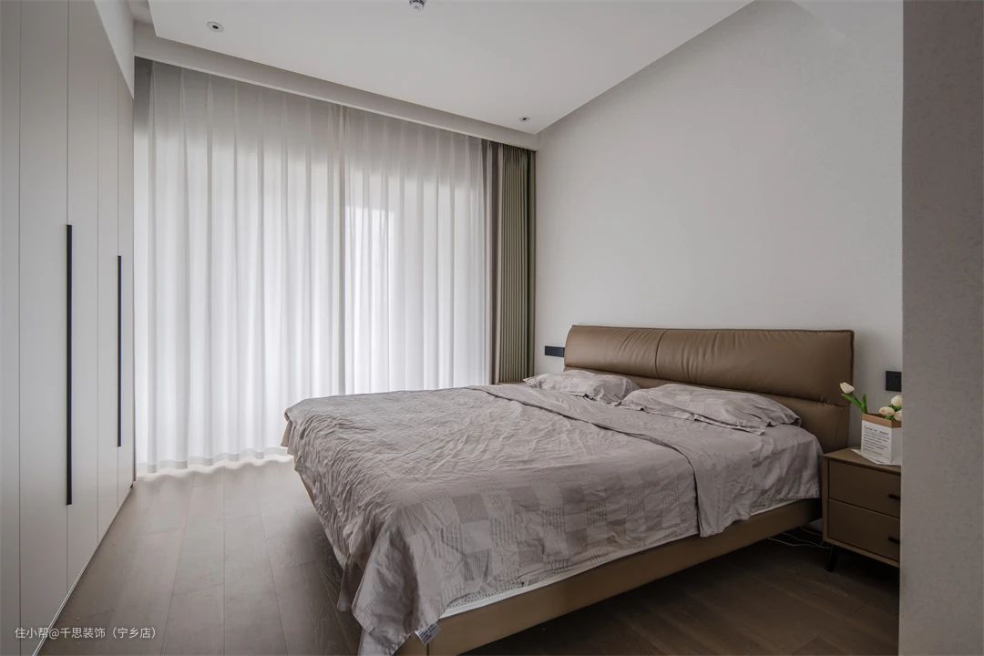 ▲ 主卧用色沉稳,以大地色为主,营造静谧舒适的适眠氛围。偏自然的色调与木地板的元素,削减一切繁杂,也是业主对于生活的态度。