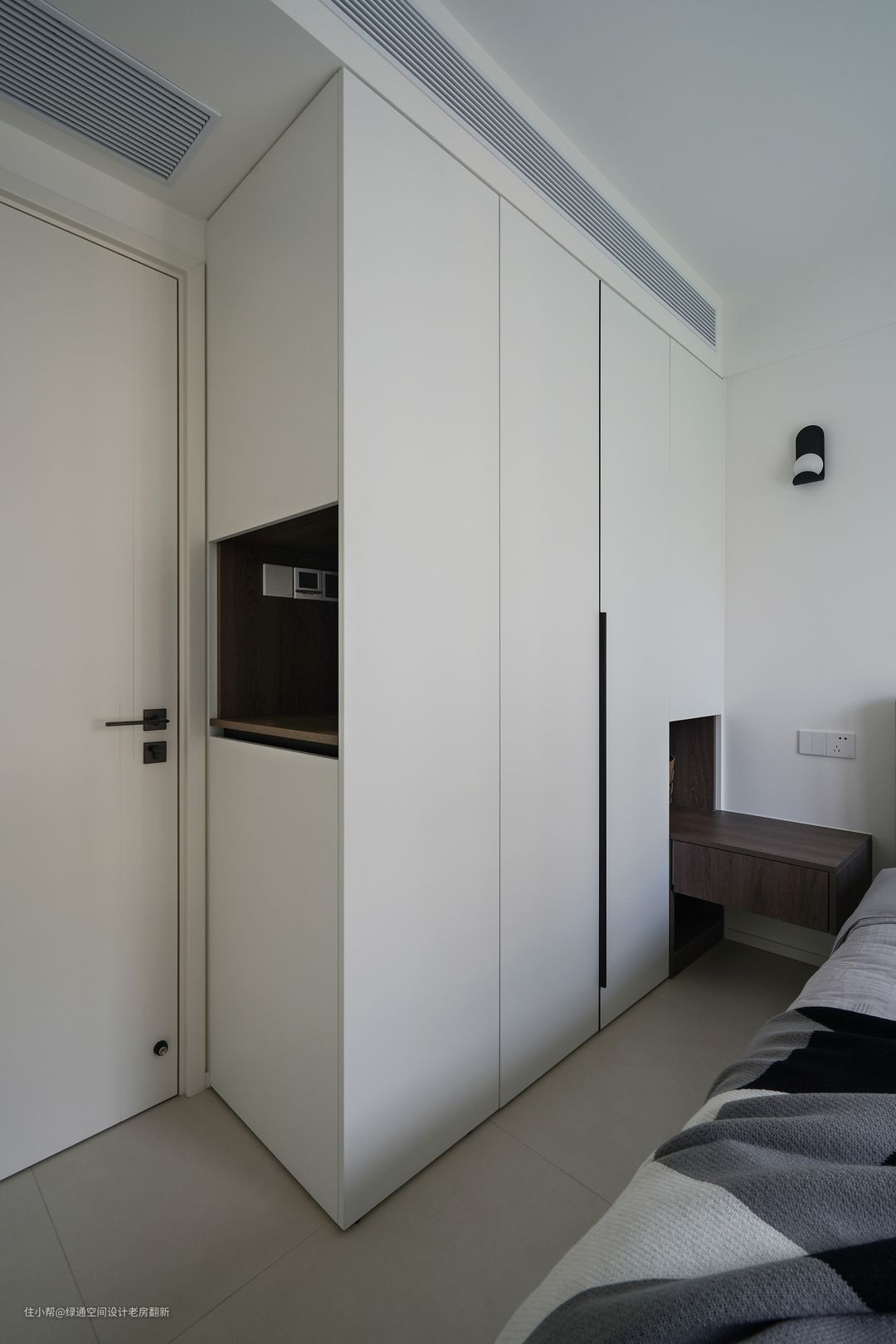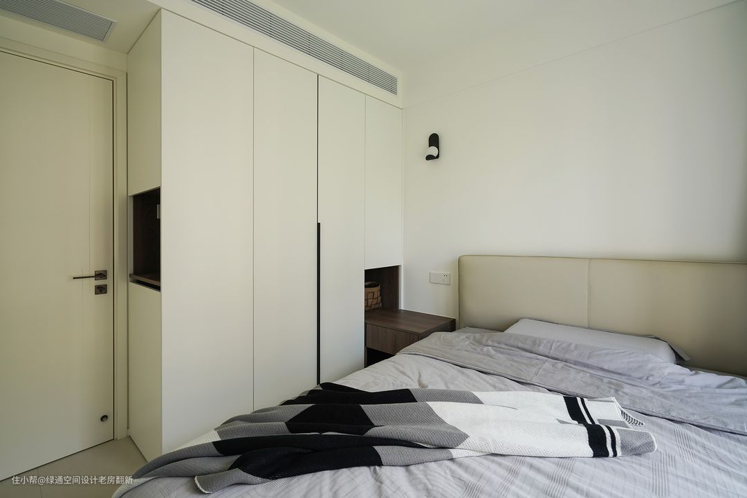 主卧背景墙采用半高木饰面,床尾做整排到顶衣柜,增加储物空间。