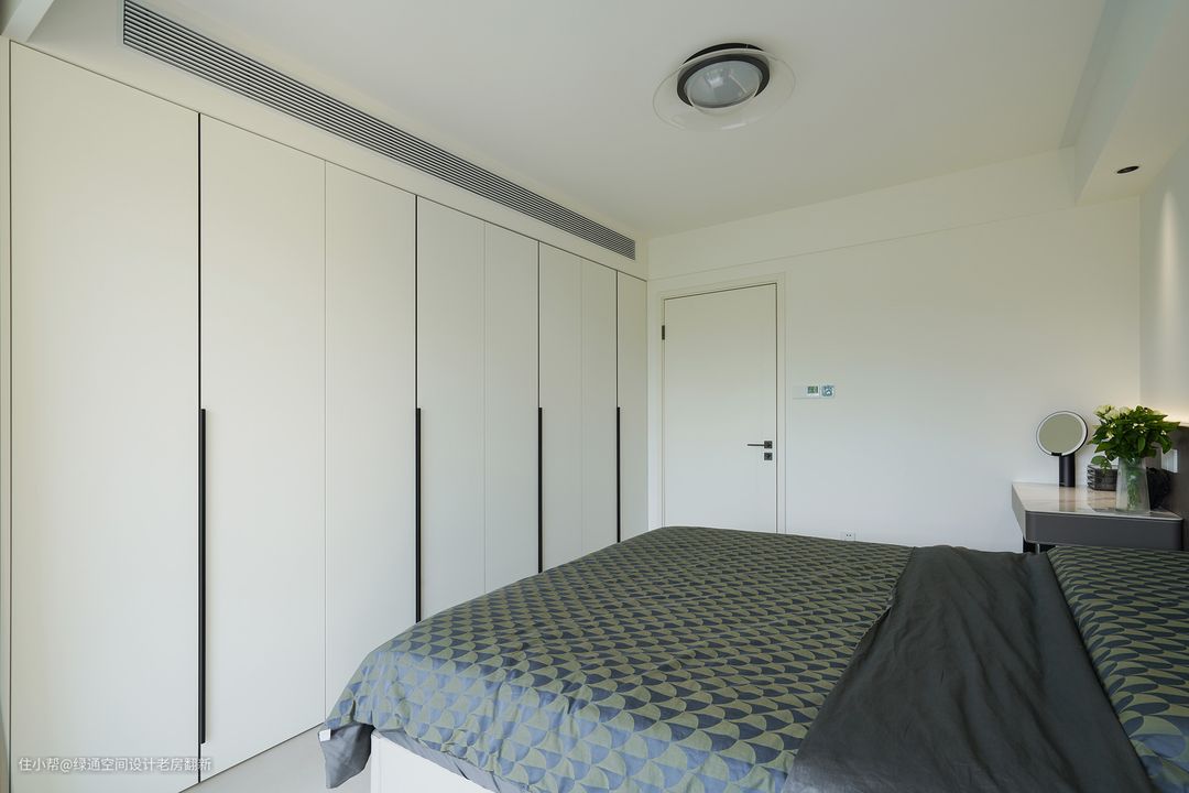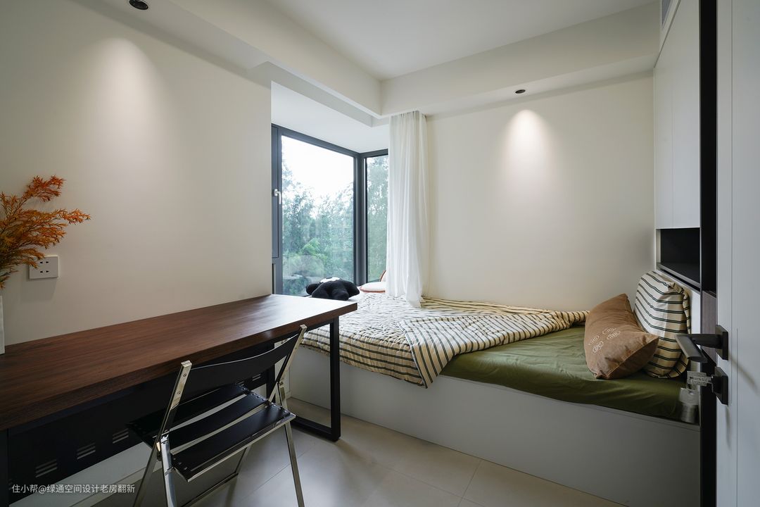 次卧做了传统的榻榻米布局,这样既弥补了空间的收纳能力,也延伸出了客房的功能,以方便父母过来小住。而且,沿着窗边放了一个简易长书桌,这里也是办公和书房的空间。 5楼的层高,很养眼,窗外生机勃勃的树林能够尽收眼底,这里拥有春绿秋橘的美景,可以感受自然生命的乐趣。 而为了弱化空间的复杂,将空调挂机隐藏在衣柜顶部,并通过线性风口遮挡,不仅不会影响到正常使用,反而让空间更加整体了。