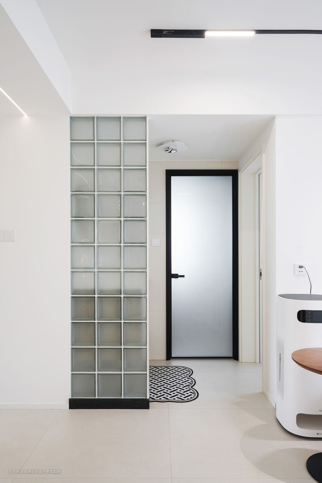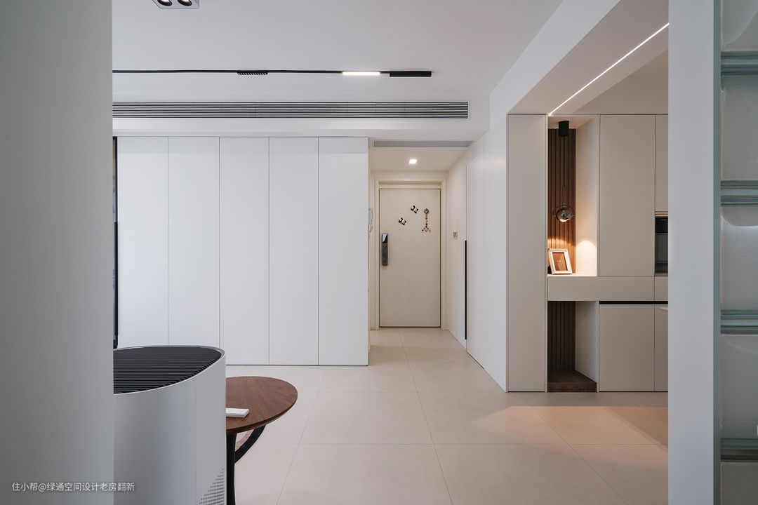 进门第一眼看到的就是当下流行的玻璃幕墙玄关设计,增加美观度的同时,还完美解决了进户门与卫生间门对着的风水问题,可谓是一石二鸟,恰到好处! 进门的衣鞋间为了保证一体隐藏式的效果,墙面也做了L型柜体链接到客厅。