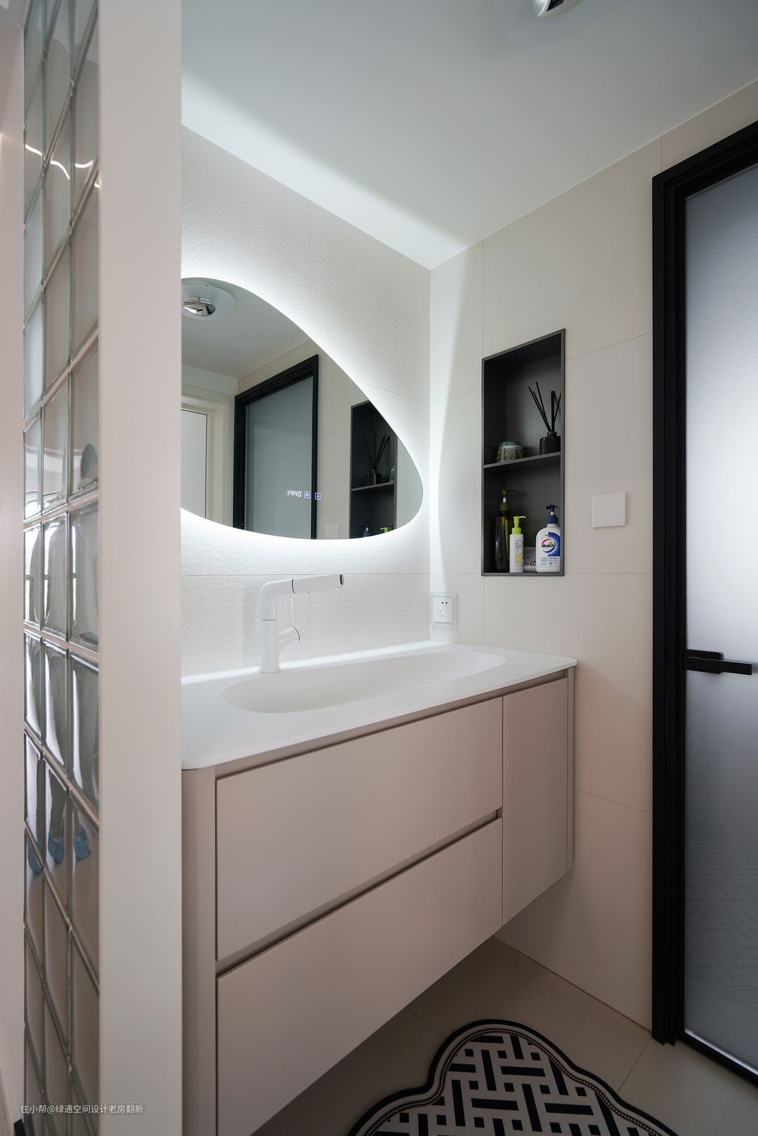 干湿分离的设计满足了一家三口的功能需求。 台盆柜选择一体盆,可以与墙地面基调更加接近;镜柜墙面选择细腻纹路的瓷砖,更显质感;干区与湿区之间做了壁龛作日常收纳,让台盆区更整洁;水龙头做墙排,不仅可以节省空间,也可以让空间看起来更加整洁。 来到卫生间内部,墙地面铺上统一的柔光砖,在保证一体化的同时,也彰显出了细腻的质感。当然,独立的淋浴间设计,也保证了使用时的舒适性,嵌墙式的玻璃隔断做到了零缝隙的处理。 整个案例看下来,不管是色彩定位,还是元素运用,都完美诠释了奶油风应有的质感。同时,半开放式的空间布局,以及大量的储物柜规划,也在使用中提升了空间的居住体验。