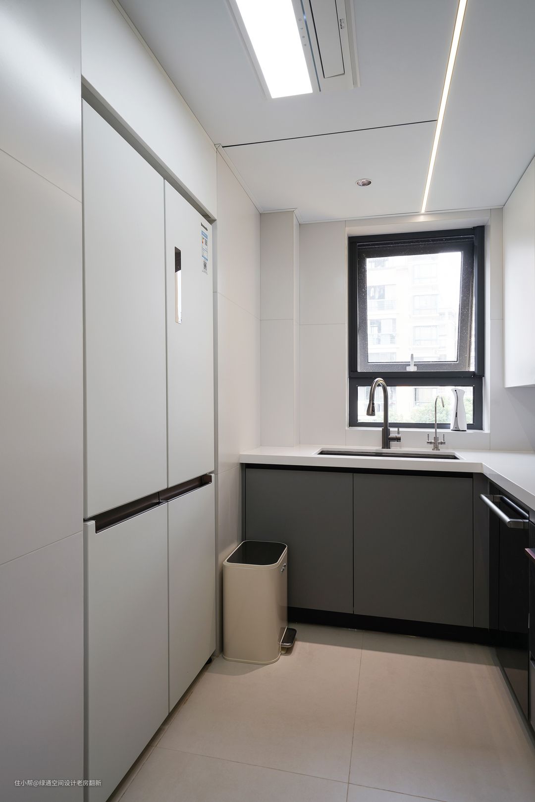 橱柜采用L形的结构来设计,并搭配上吊柜、高柜,虽说少了一点操作空间,但收纳能力却是十分强大的。将冰箱等电器内嵌在柜体中,与背面客厅电视柜完美地融合在一起,让空间保证了工整。