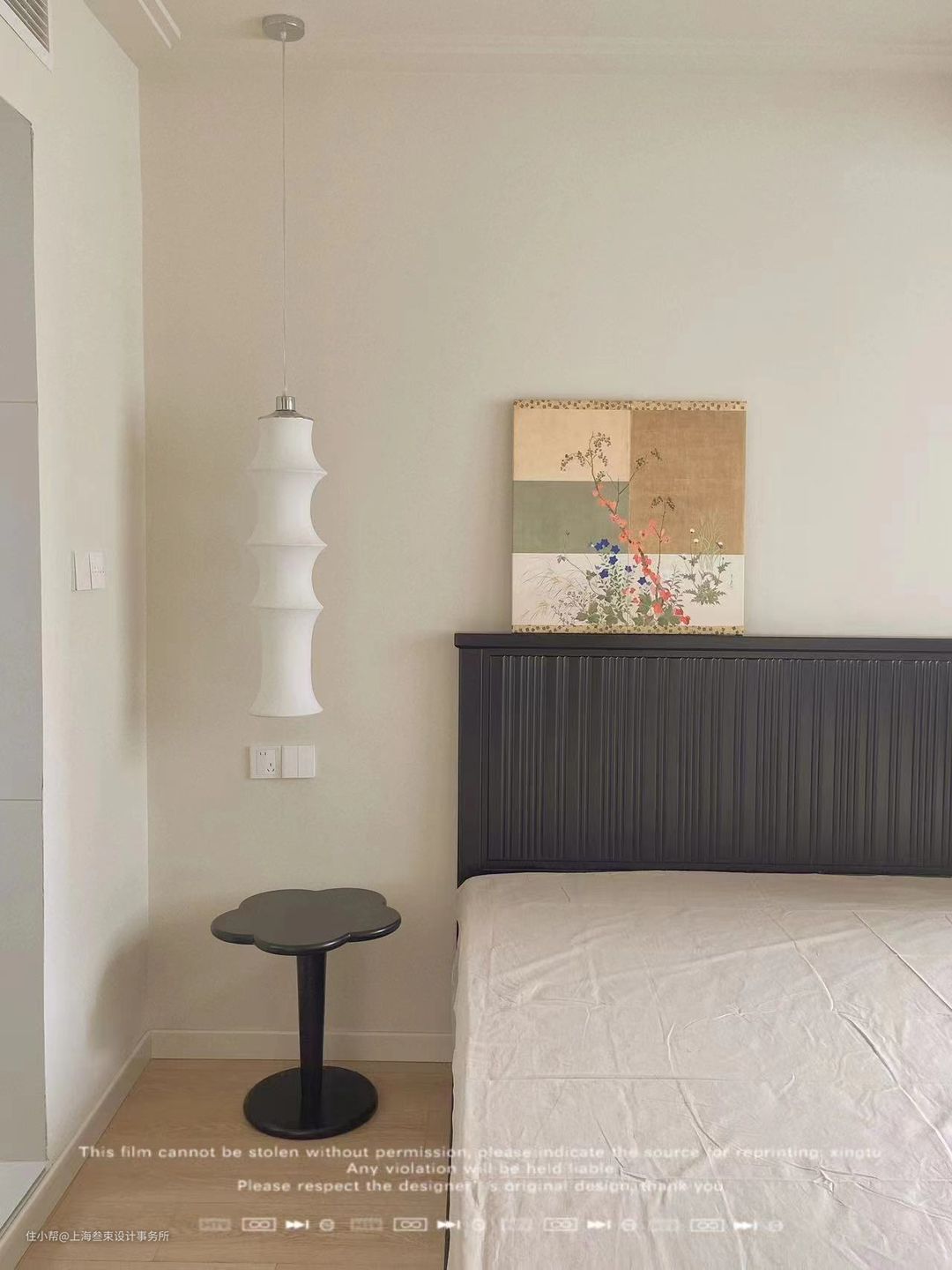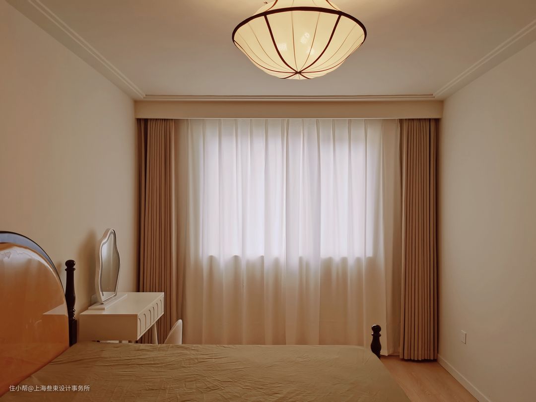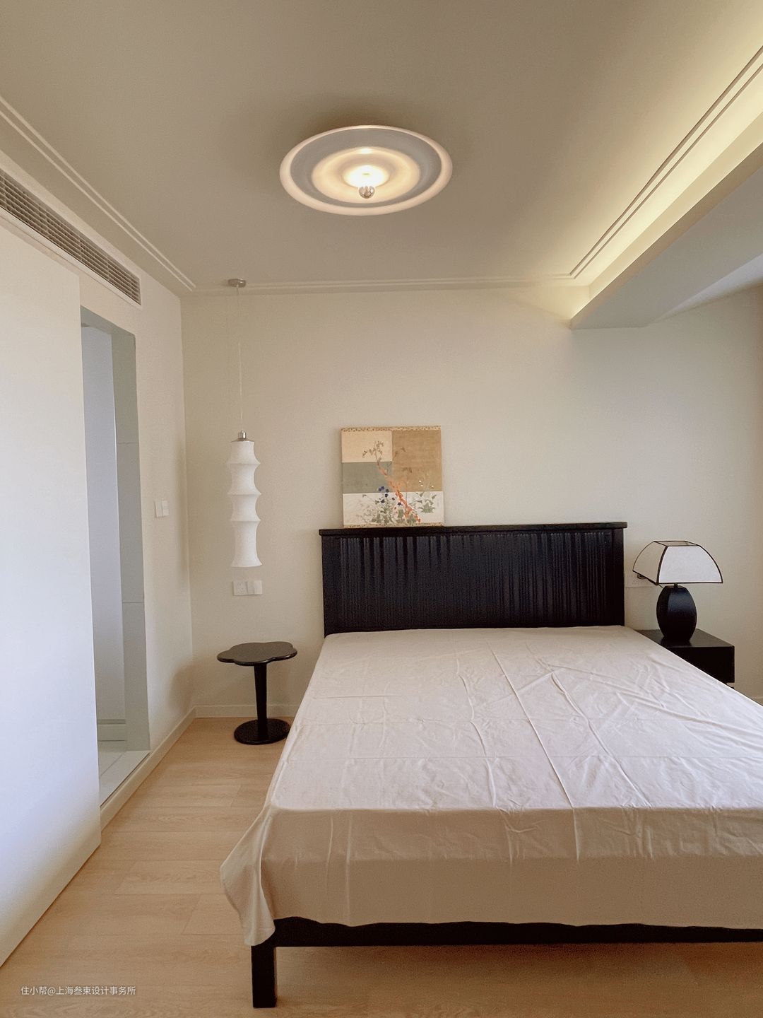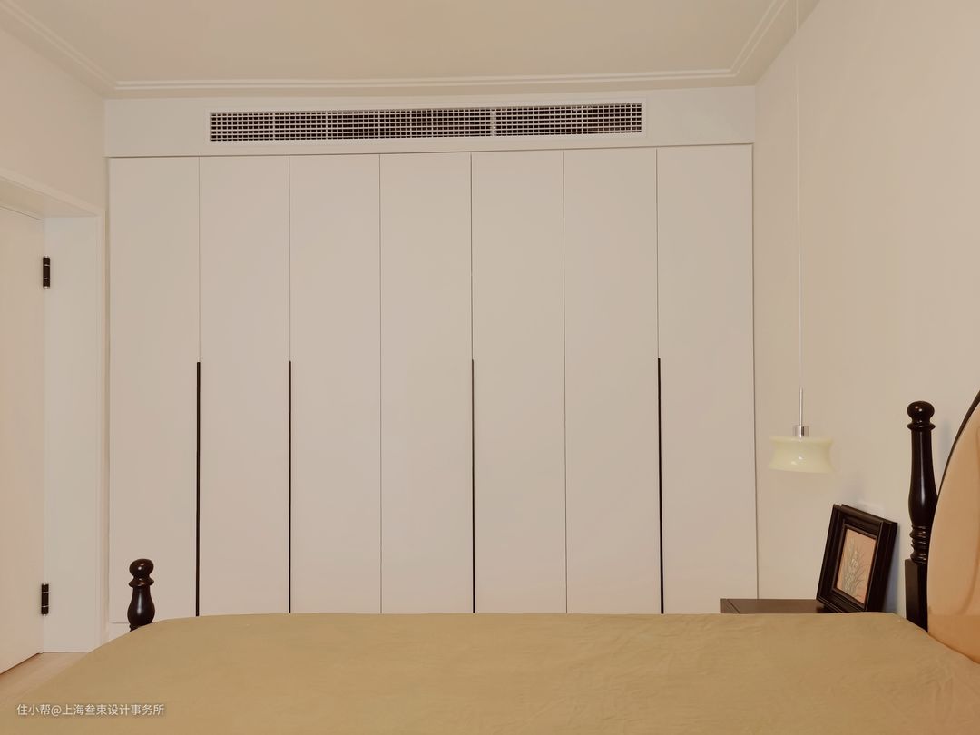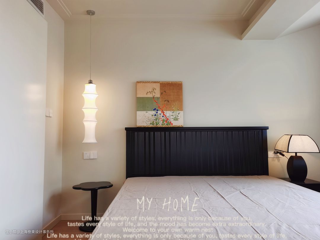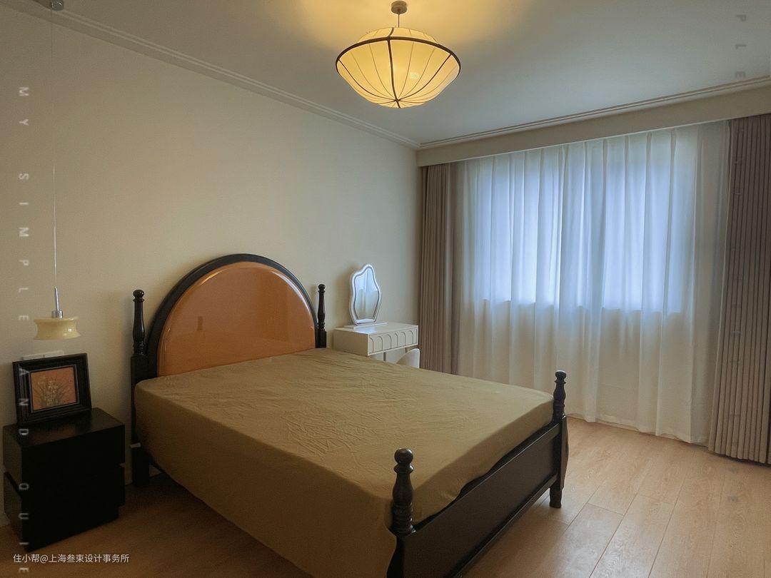 设计亮点: 1:主卧中间有梁,设计采用斜面拉直阳口吊顶,暗藏灯带,既起到弱化左右,又能给空间氛围感; 2:主卧改为含衣帽间,卫生间的大套间。一开门就可以看见复古的大床和一副带有故事性的装饰画,让人的视觉里都出充满了更多的吸引人的局部和细节,仿佛感觉穿越了; 3:浅色木纹地板,保持空间的整体性。顶部适当的氛围光,一侧是布艺的竹节白色吊灯、一侧是黑色复古的床头台灯,既是颜色的对比,又是空间的对比,不对称的美。把握每一处的细节; 4:大面积的开窗让户外的美景和阳光都穿越到室内空间,释放出舒适安逸又颇为沉稳的讯息; 5:衣帽间采用移门形式,进出不挡空间。