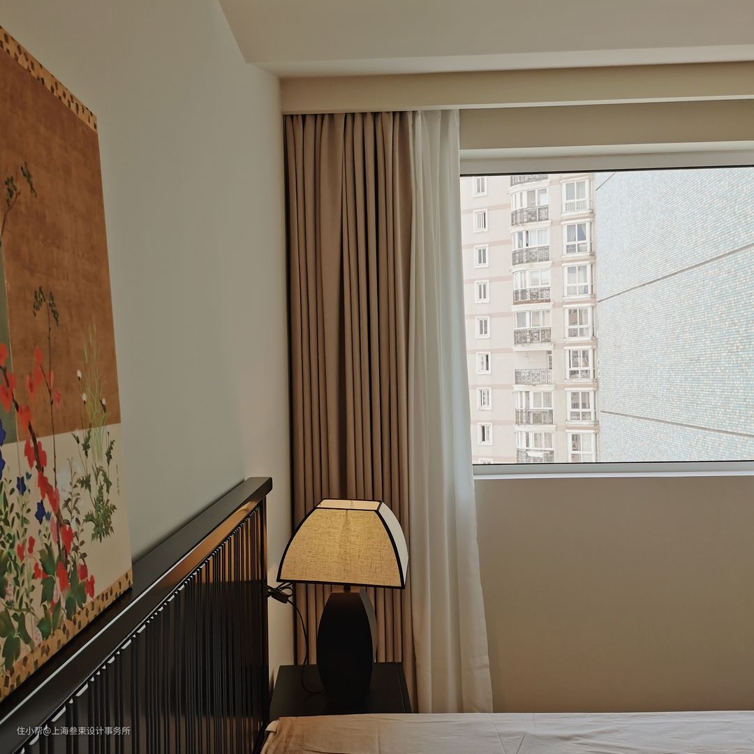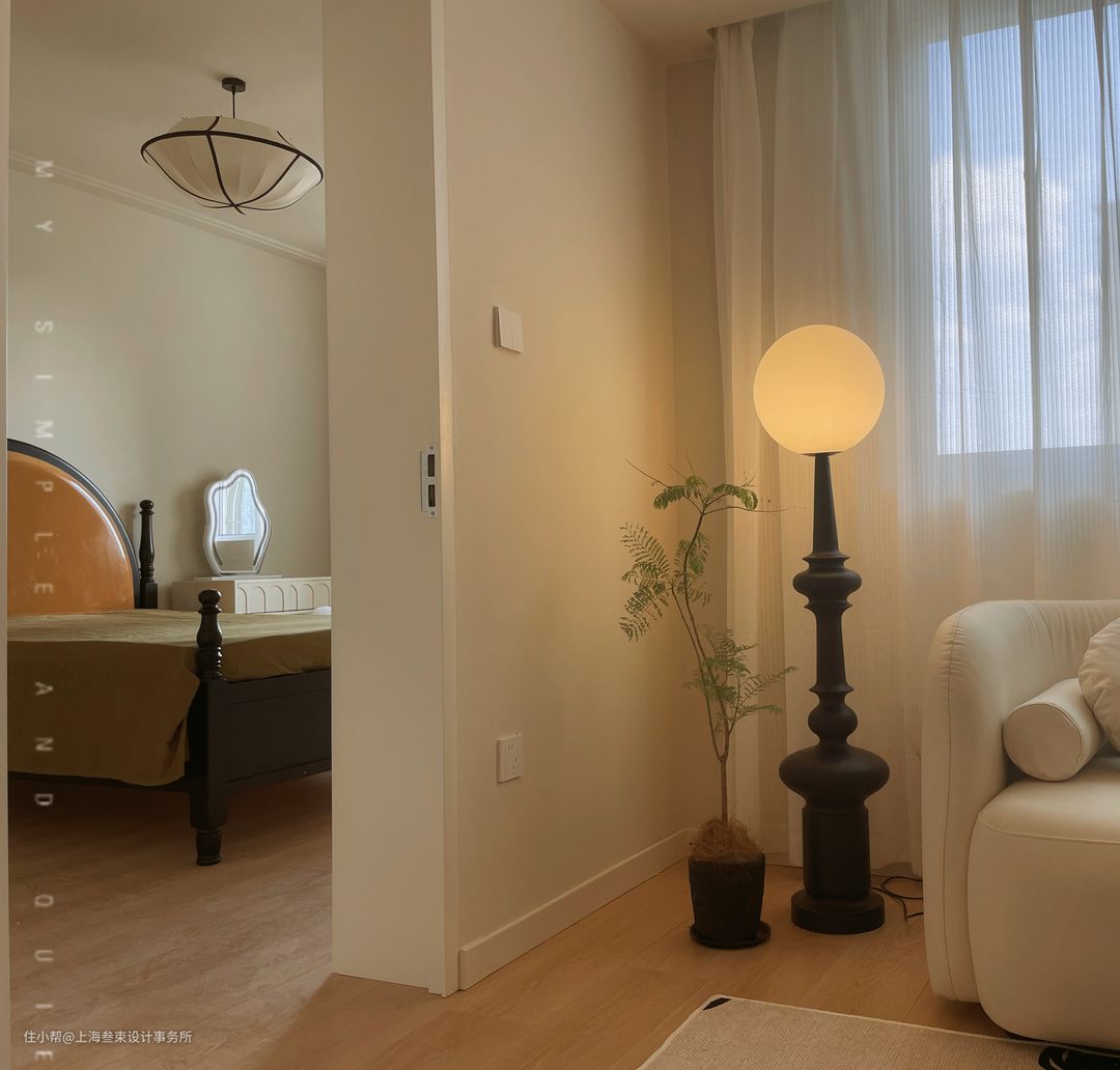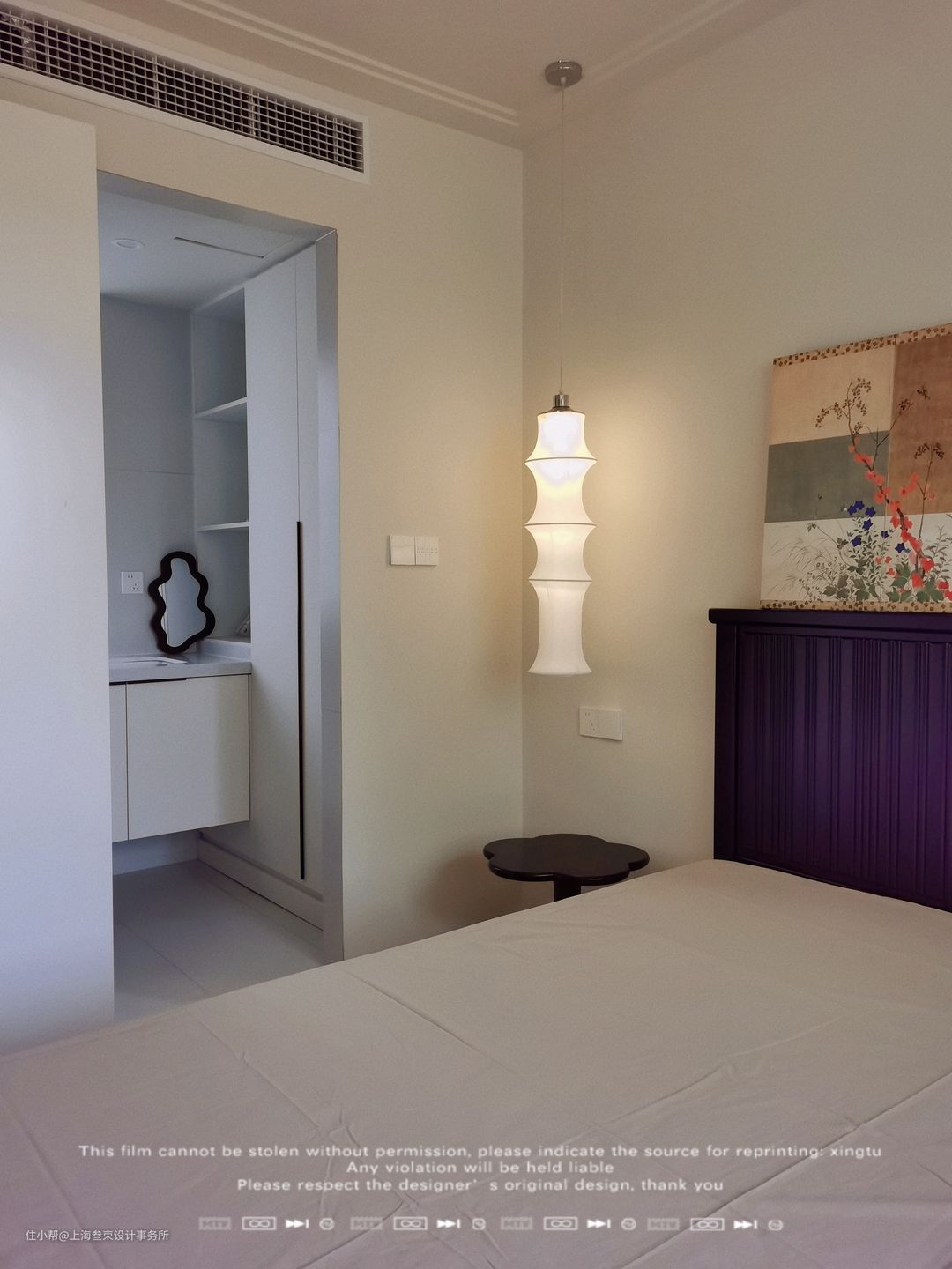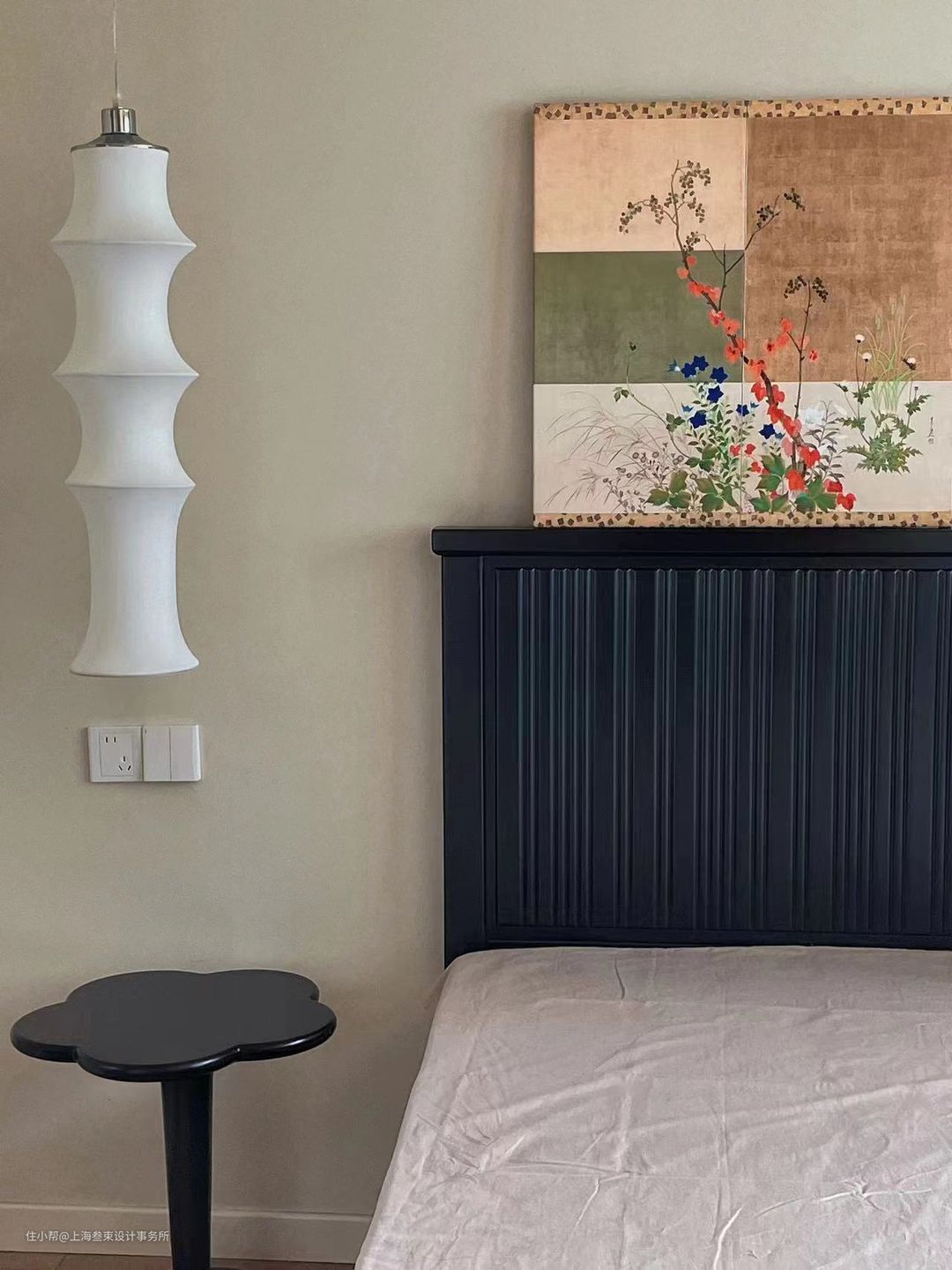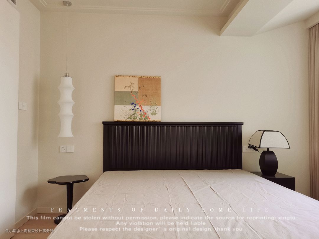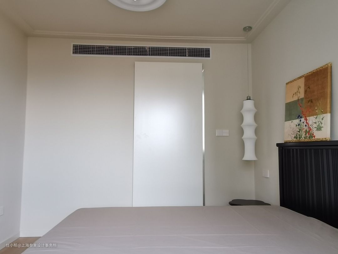 设计亮点: 1:主卧中间有梁,设计采用斜面拉直阳口吊顶,暗藏灯带,既起到弱化左右,又能给空间氛围感; 2:主卧改为含衣帽间,卫生间的大套间。一开门就可以看见复古的大床和一副带有故事性的装饰画,让人的视觉里都出充满了更多的吸引人的局部和细节,仿佛感觉穿越了; 3:浅色木纹地板,保持空间的整体性。顶部适当的氛围光,一侧是布艺的竹节白色吊灯、一侧是黑色复古的床头台灯,既是颜色的对比,又是空间的对比,不对称的美。把握每一处的细节; 4:大面积的开窗让户外的美景和阳光都穿越到室内空间,释放出舒适安逸又颇为沉稳的讯息; 5:衣帽间采用移门形式,进出不挡空间。