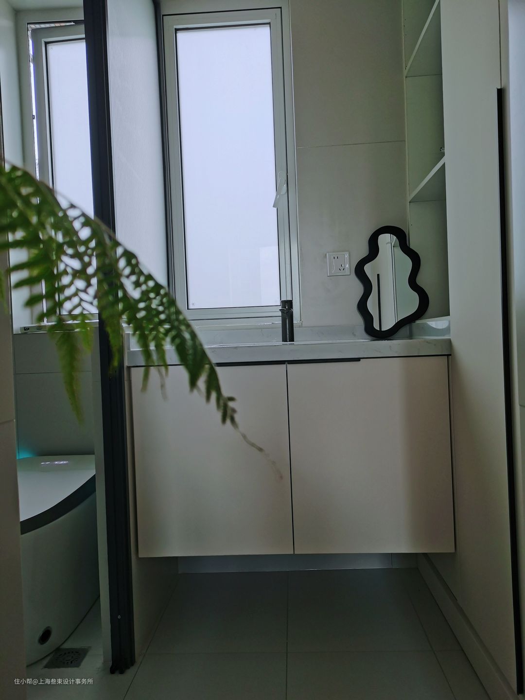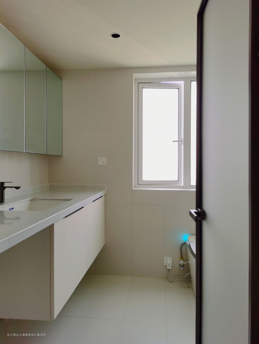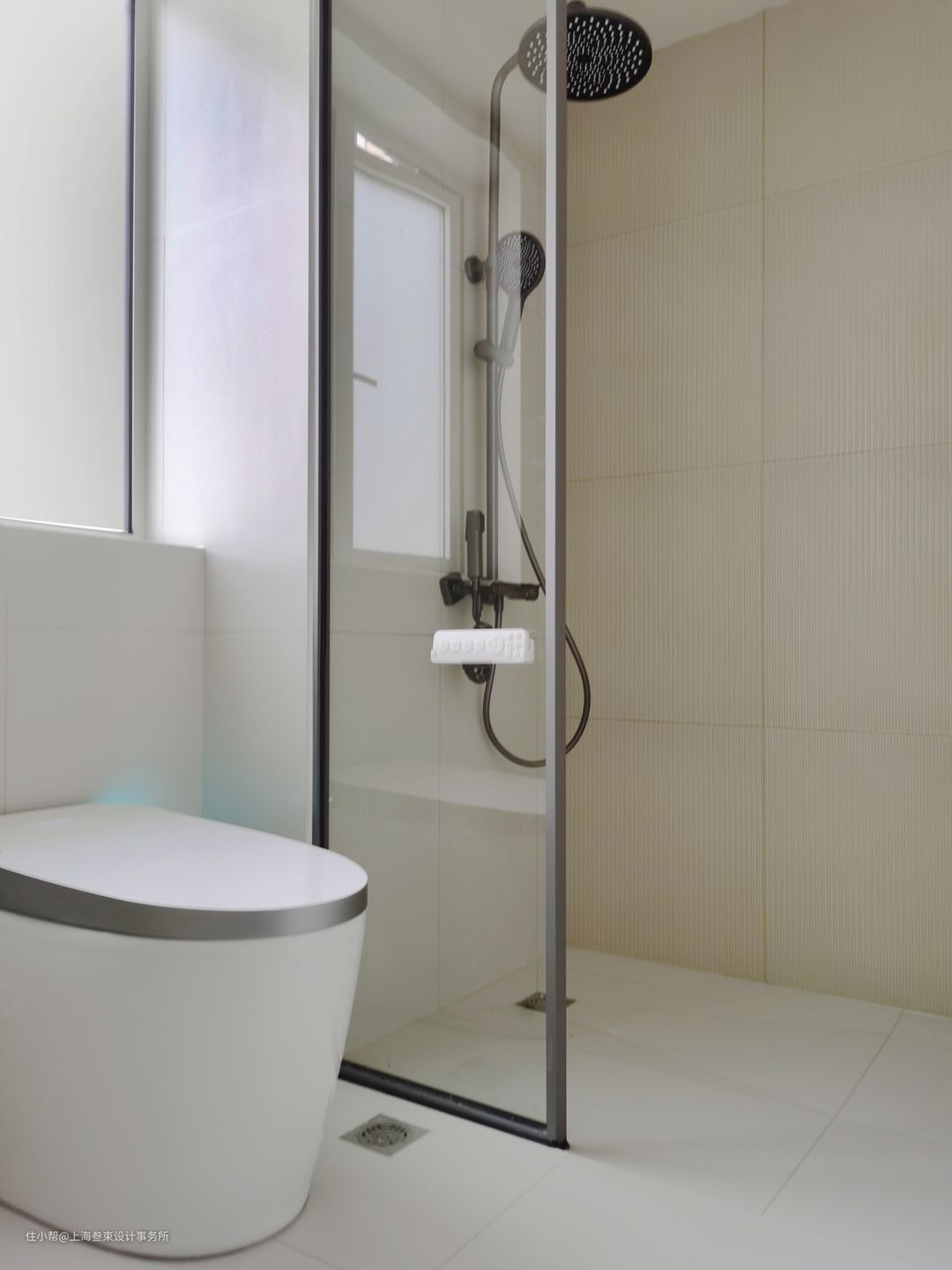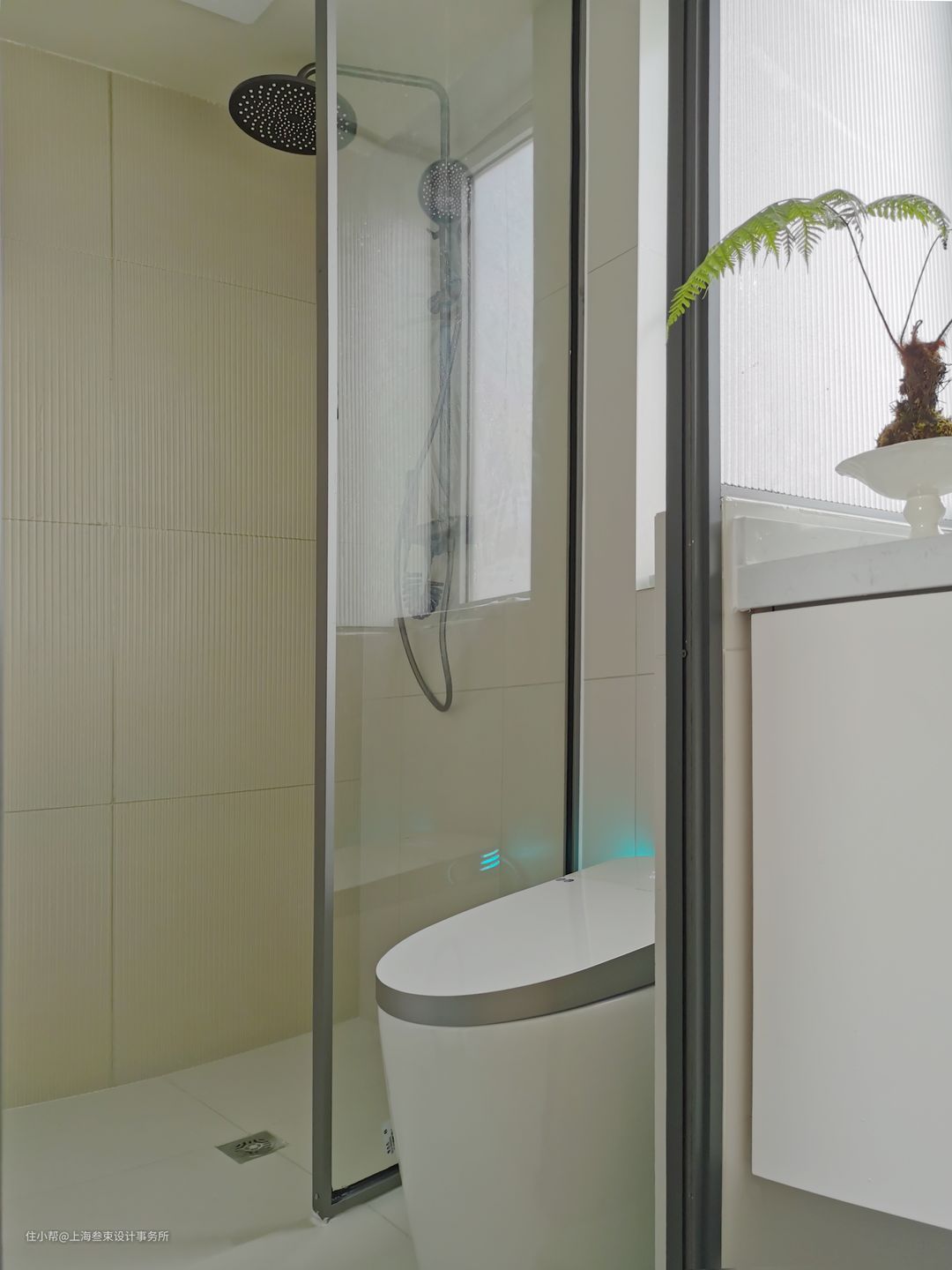 设计亮点: 1:干湿分离,洗漱、卫浴、衣帽间三分离式,清爽又整洁; 2:改造后,右侧为干区,衣帽间和洗漱台,左侧为如厕、淋浴; 3:悬空台下盆,下沉式的淋浴间方便打扫; 4:墙面是咖色波浪纹400*800墙砖,地面采用是400*800的奶油色哑光砖。