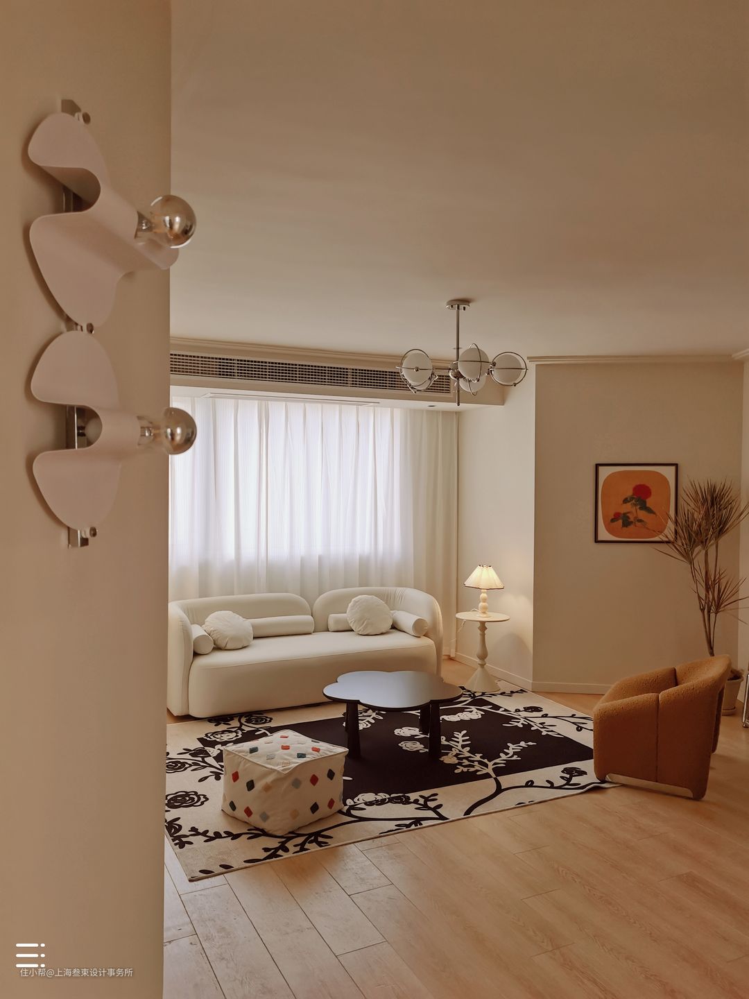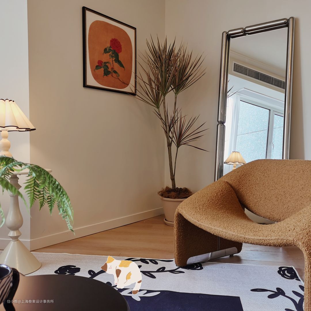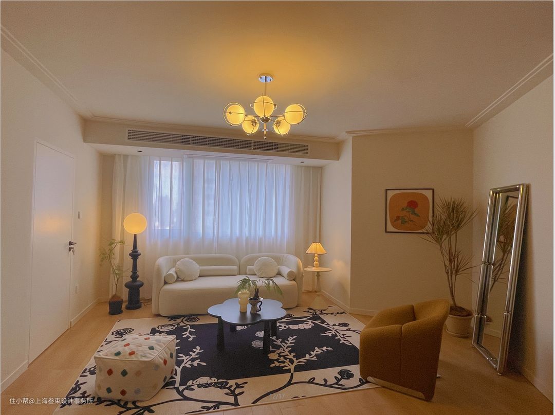设计亮点: 奶油色的乳胶漆、原木色地板、丰富多彩的软装,相互碰撞交织出一种复古的观感,怀旧又温馨; 1:部分吊顶形式,安装中央空调,四周采用一圈角线装饰,利用斜角处,安装烤漆金属壁灯装饰,弱化此处空间; 2:经典的黄色法兰绒螃蟹椅、耐看方便整理的皮质双人沙发、俏皮慵懒的波点沙发矮凳,再搭配造型花瓣的黑色烤漆茶几,和黑白的花朵的编织地毯,和谐又统一的构成了一个具有业主专属个性,又充满舒服的空间; 3:ins风落地镜、复古山茶花装饰画和七彩马尾铁绿植,是为业主设计的看书一角,也是休时做做瑜伽,更加是空间的点睛之笔。