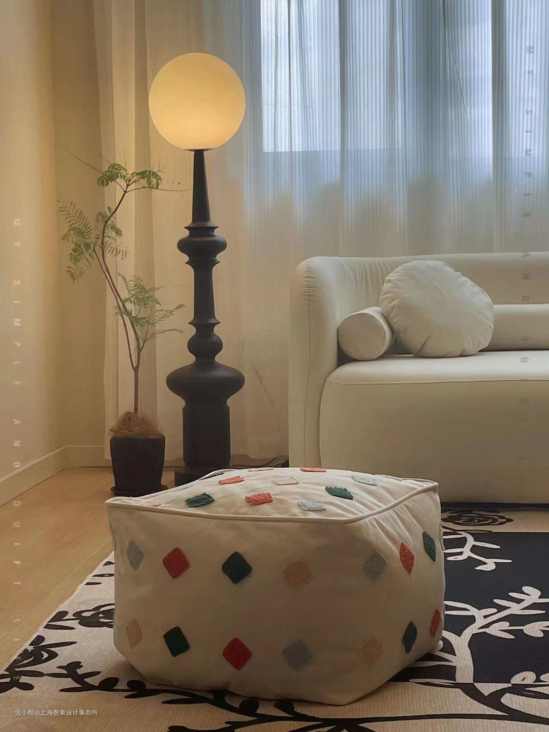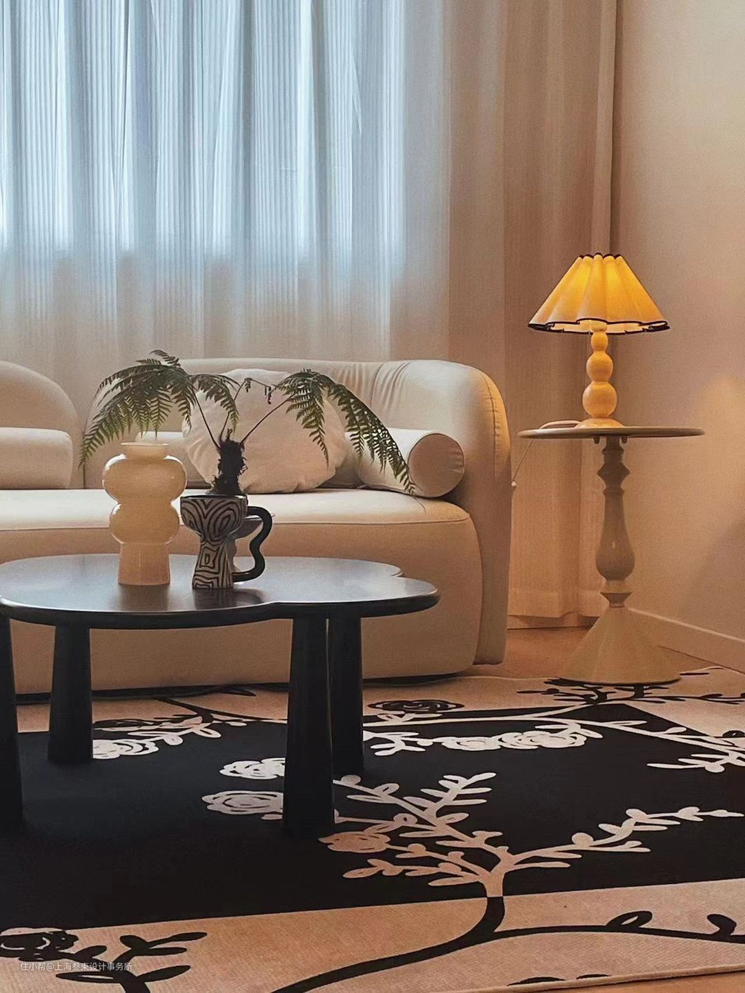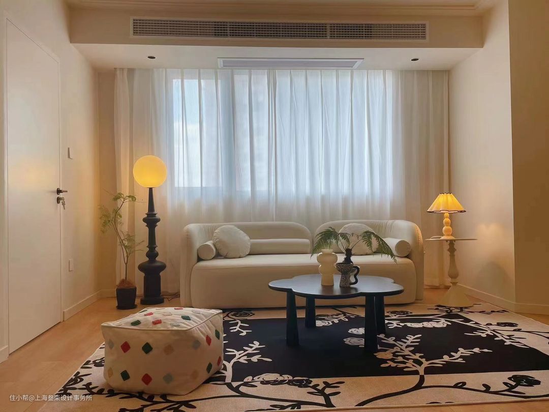 设计亮点: 奶油色的乳胶漆、原木色地板、丰富多彩的软装,相互碰撞交织出一种复古的观感,怀旧又温馨; 1:部分吊顶形式,安装中央空调,四周采用一圈角线装饰,利用斜角处,安装烤漆金属壁灯装饰,弱化此处空间; 2:经典的黄色法兰绒螃蟹椅、耐看方便整理的皮质双人沙发、俏皮慵懒的波点沙发矮凳,再搭配造型花瓣的黑色烤漆茶几,和黑白的花朵的编织地毯,和谐又统一的构成了一个具有业主专属个性,又充满舒服的空间; 3:ins风落地镜、复古山茶花装饰画和七彩马尾铁绿植,是为业主设计的看书一角,也是休时做做瑜伽,更加是空间的点睛之笔。