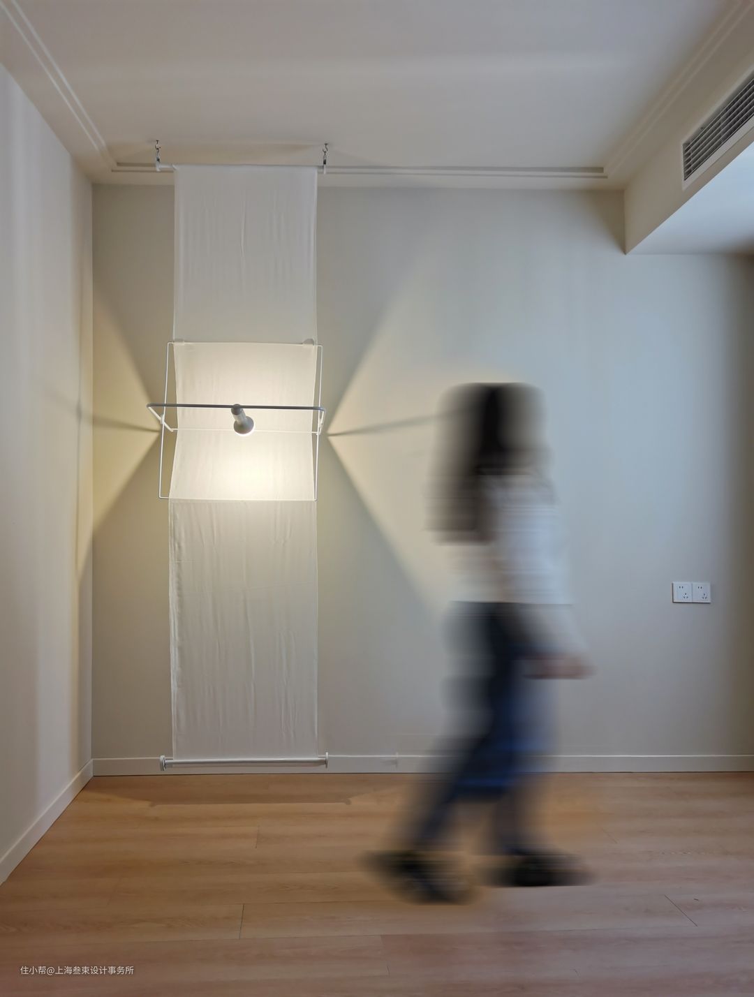 设计亮点: 1:午后的小憩,就在这书房和自己独处,隔断式复古布艺吊灯,从吊顶处下降到地面,黄色的灯光撒到布面及墙上,独特的光效,就像一双翅膀。打造安静而有禅思的空间,给人一些想象。