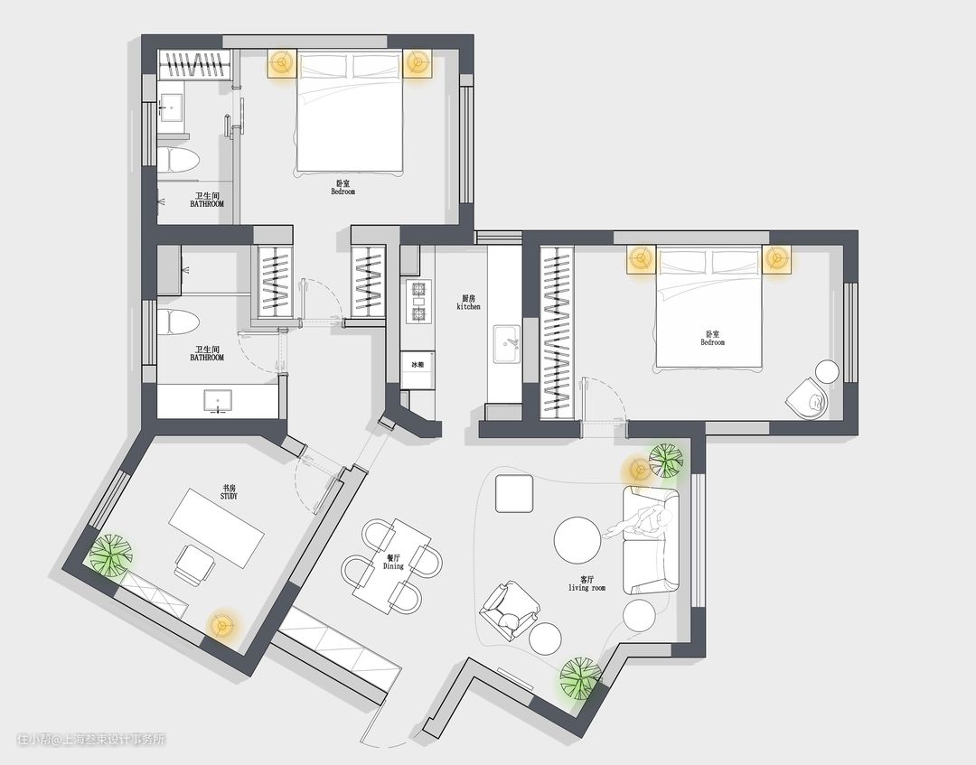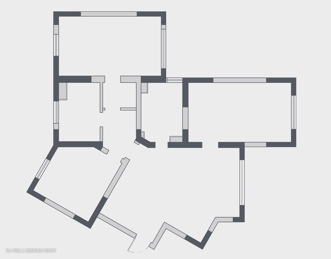 这是一套异形的三居室,位于武定西路静安区,是一套比较老的公寓房。但是小区环境幽静,进去要穿过幽静的小道,属于闹市中比较舒服的公寓。业主是一位女性IT行业者,喜欢法式的浪漫,想要打造一个舒适的,优雅的,温馨复古的居住空间。 户型解析: 1:厨房纵深比较大,不适合做开敞式的厨房; 2:客餐厅异形,多处斜角,但空间比较宽敞; 3:三居室的户型,一个卫生间; 4:储物空间比较少。