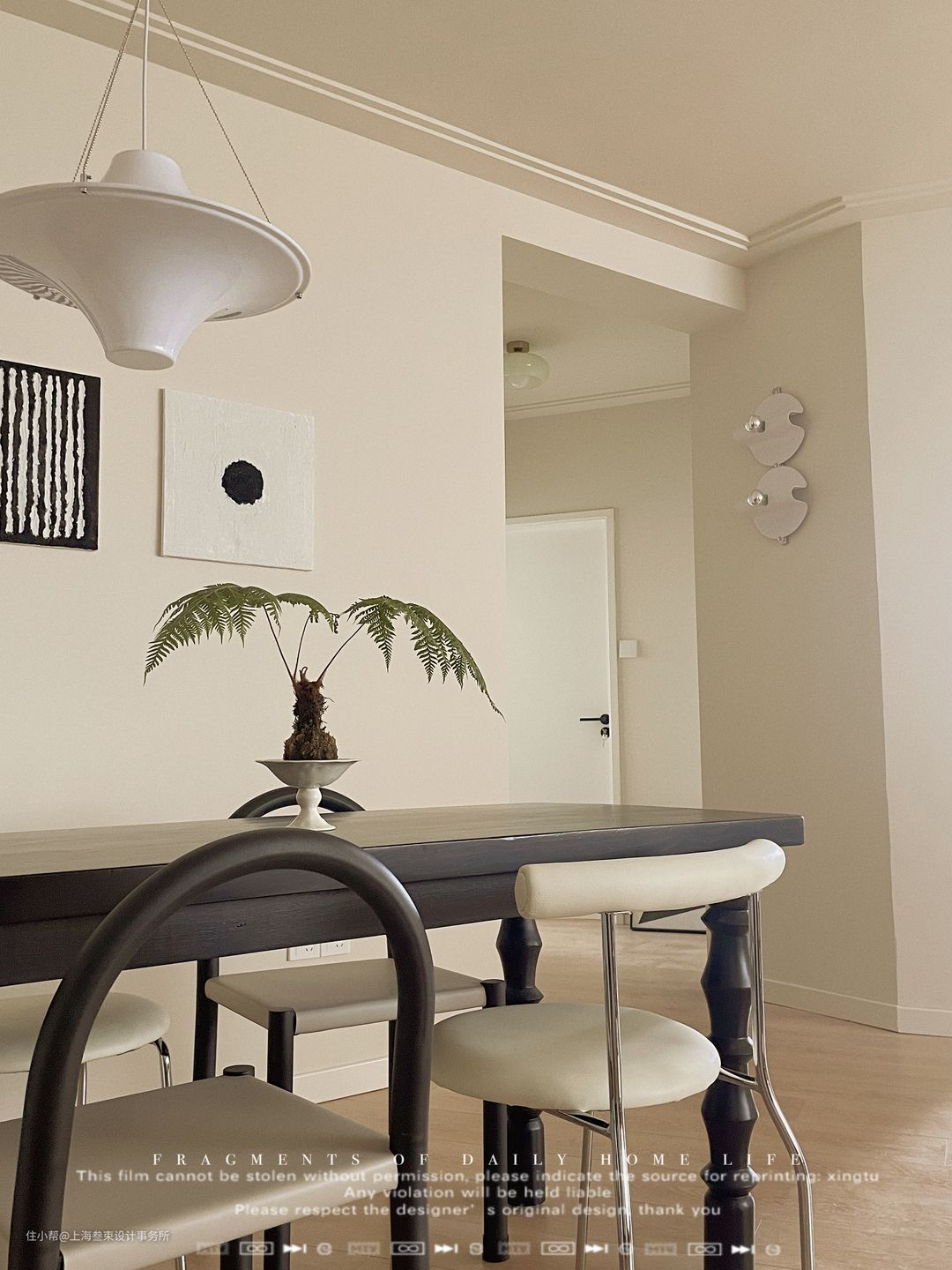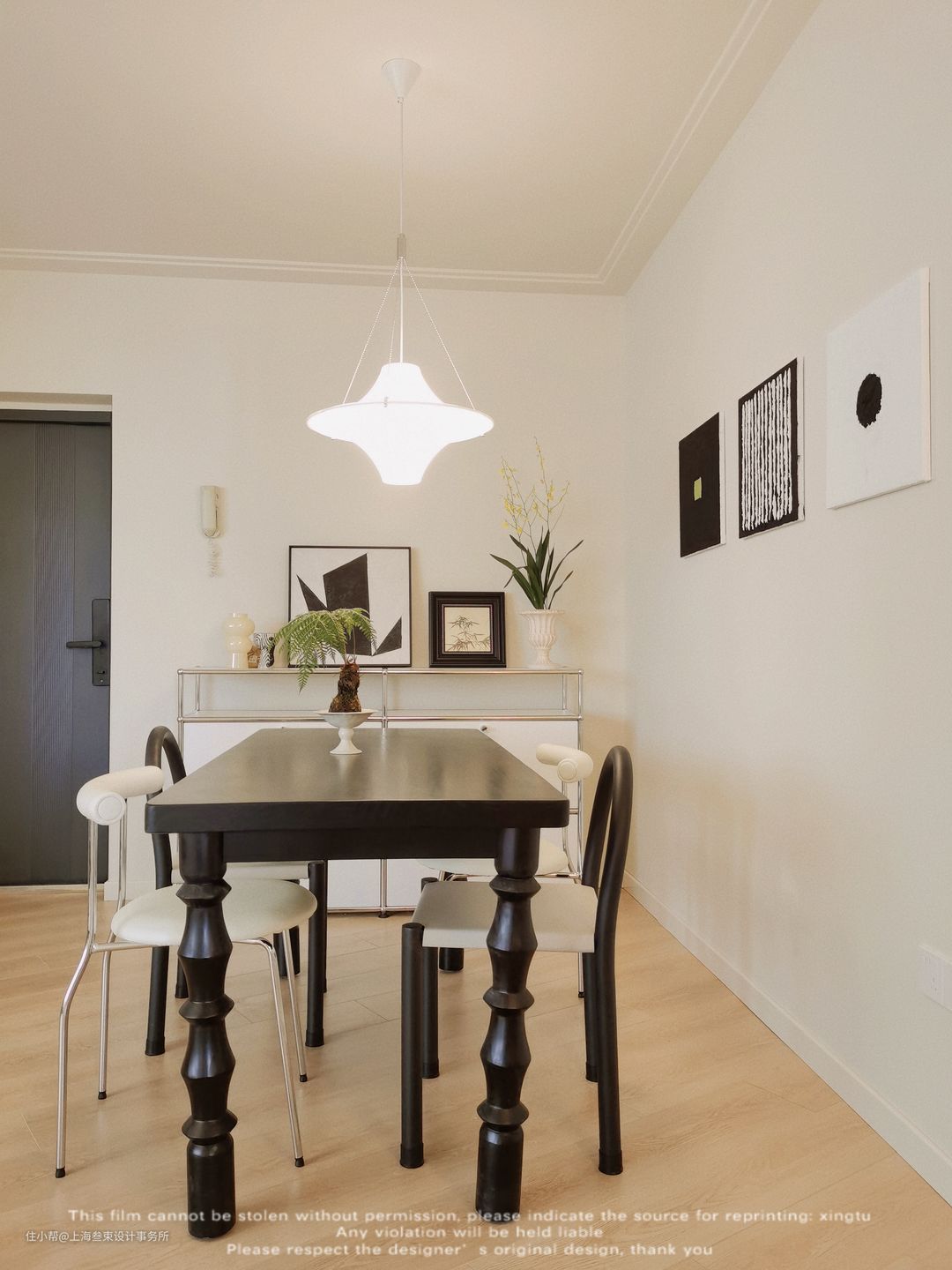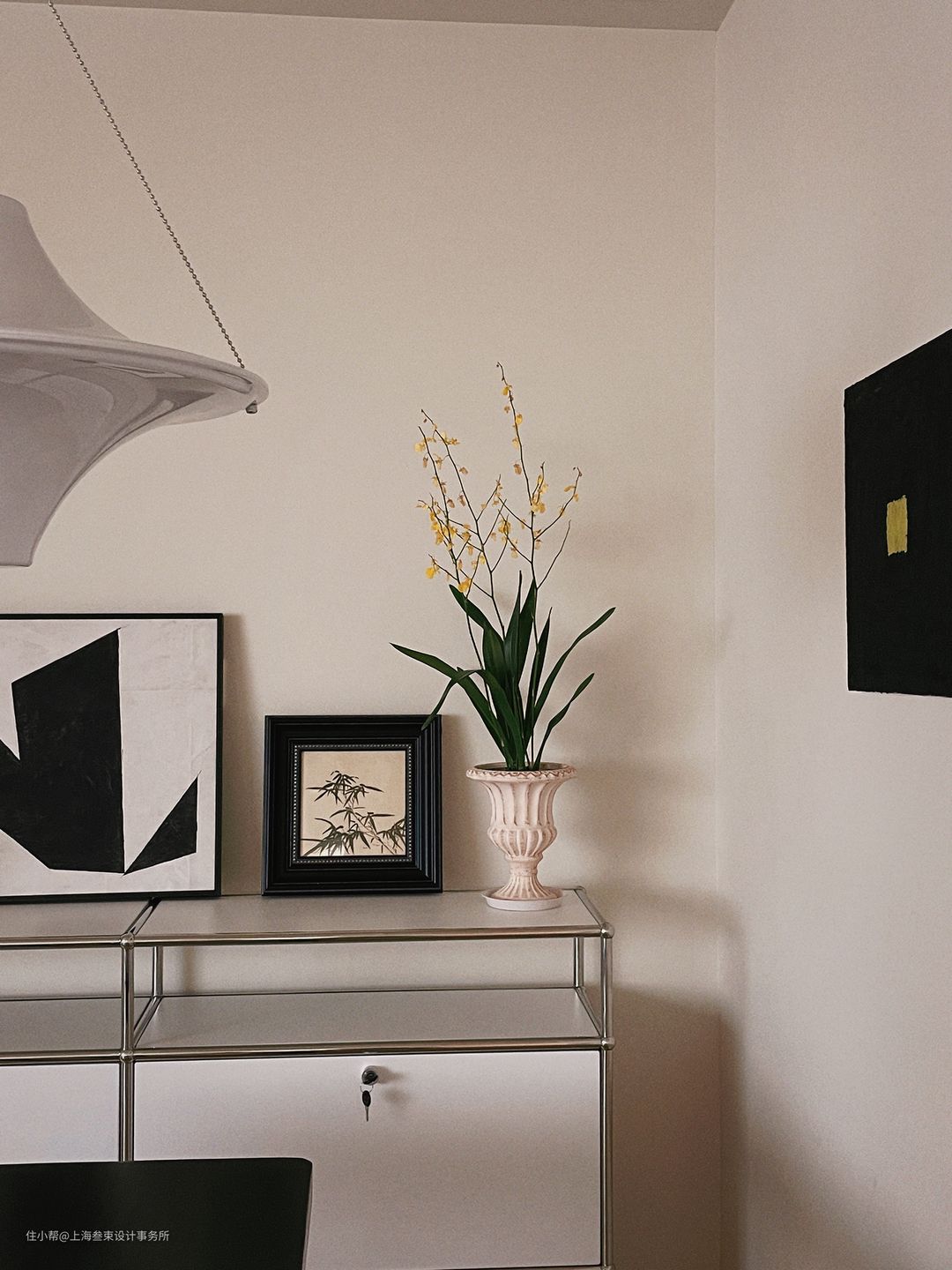 家,不用装成别人羡慕的样子,但一定是自己喜欢的样子。 设计亮点: 1:去掉传统的定制柜,采用可随意挪动的 白色+金属储物柜。既能当餐边柜,又能储物。搭配黄色的跳舞兰、黑色复古小框装饰画,大胆的配色和独具匠心的搭配,从门厅开始便埋下伏笔; 2:黑色复古的大餐桌、形状不一的白色餐椅,搭配奶白色亚克力飞碟吊灯,复古与现代的碰撞,给空间无限可能性。立体肌理的三幅装饰画,也是业主闲情时自己的涂鸦。平常下班回家在这里坐着吃着丰富的美味佳肴,又或者是早上的一杯咖啡,美好的一天就从这里开始。