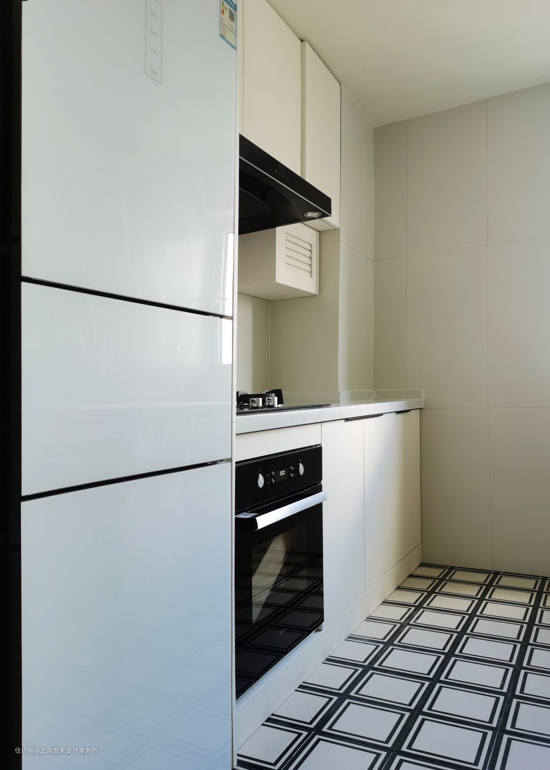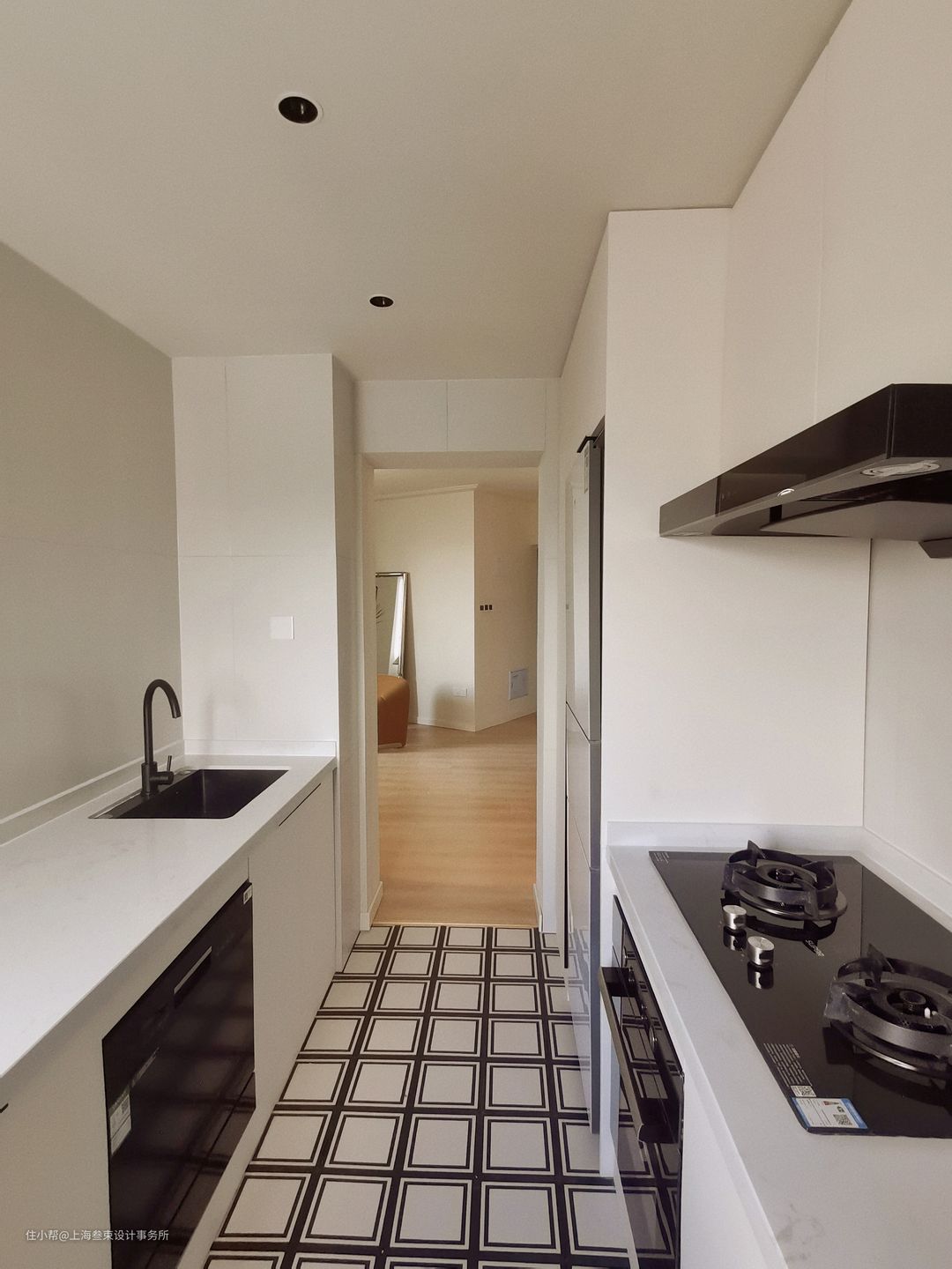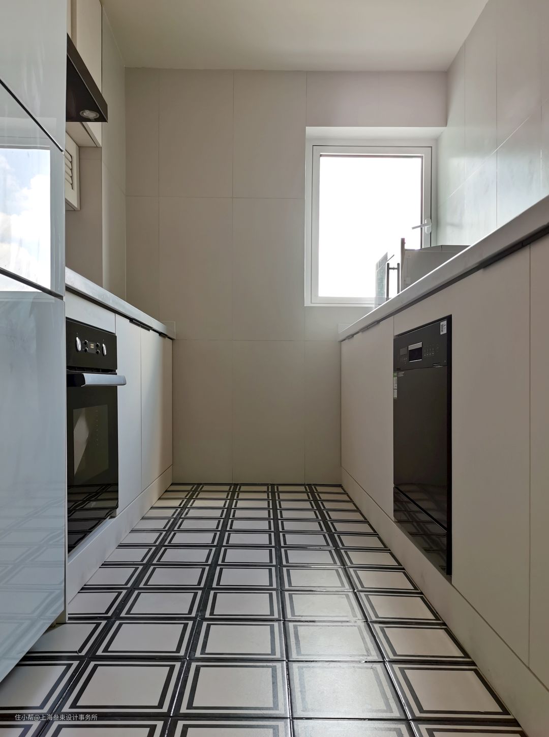 设计亮点: 1:U字型的厨房设计,采用半开放式厨房,开敞门,既能增加采光又能显得空间通透; 2:黑白回字形地砖,石膏板吊顶,嵌入式嵌入式洗碗机、蒸烤一体机、冰箱多样化的收纳空间形式,让空间更加整洁干净;