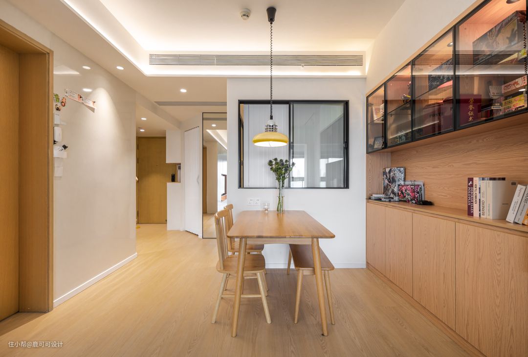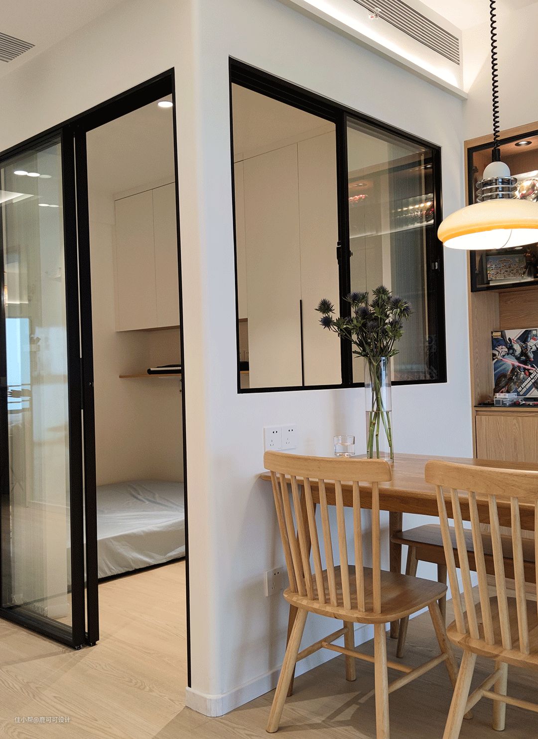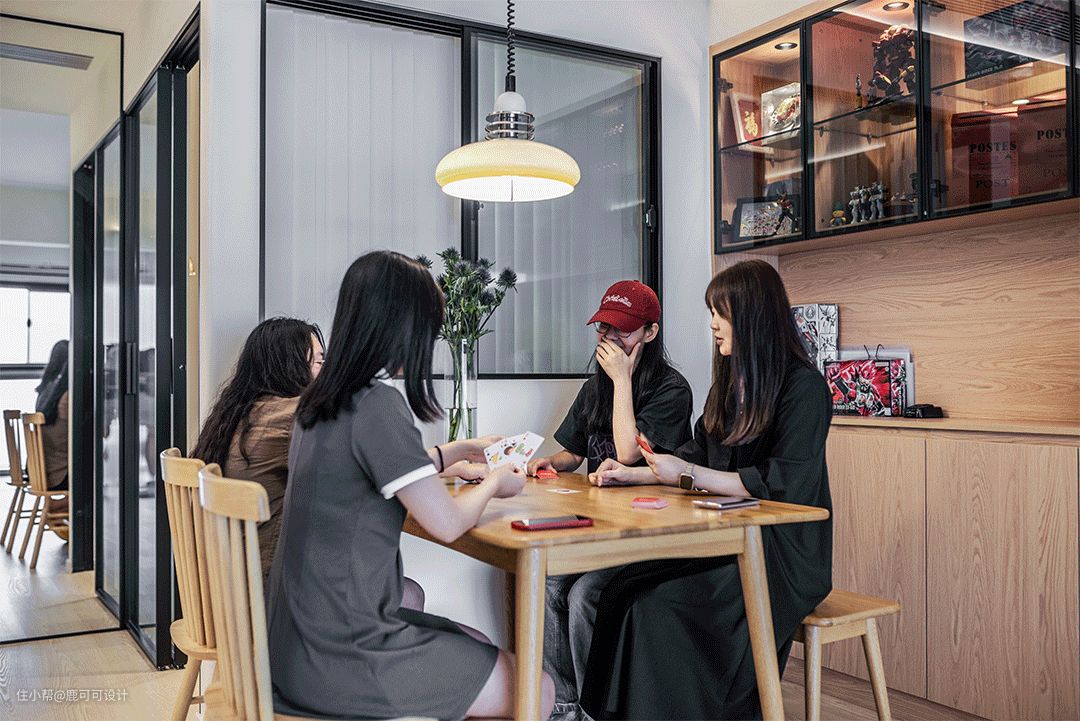 △ 增加了一个卧室之后,餐厅并不会因为缩小了尺寸而变的局促,宽敞的过道,留白的墙面,还有次卧的小窗都让餐厅充满了呼吸感,让人在这个看着有条理,又温馨的空间非常的放松。 餐边柜是保留下来的旧家具,还非常新,洒脱的黑色边框与黑玻镜面柜门和新增的小卧室窗框相呼应,整体感100%。 △拍摄当天的空余时间团队小伙伴与屋主玩起了“干瞪眼”,她说平时除了吃饭还会在餐桌做手工,朋友来了有时候也会玩一玩扑克~休闲时刻,宅家也可以很快乐。 △很有幸听到音乐老师(屋主)现场给我们唱歌,真好听!哈哈哈,如果她不累我们可以一直听下去,羡慕她先生,在家就可以点歌。家里的氛围好,手机咔咔一拍就是美图。 屋主说,有了餐桌后面的珐琅板,每个到家里来的朋友都可以签上名字,小小的举动,让生活又多了一种仪式感。她还说,平时出去玩的票根,演唱会门票,旅行解锁一个新的地方买的冰箱贴,都会收集贴在这面珐琅板上面,慢慢的填满它。 我觉得这种仪式很好,每一个物品都是美好回忆的启动键,看一眼就会想起去过的地方,让心情都愉悦了。