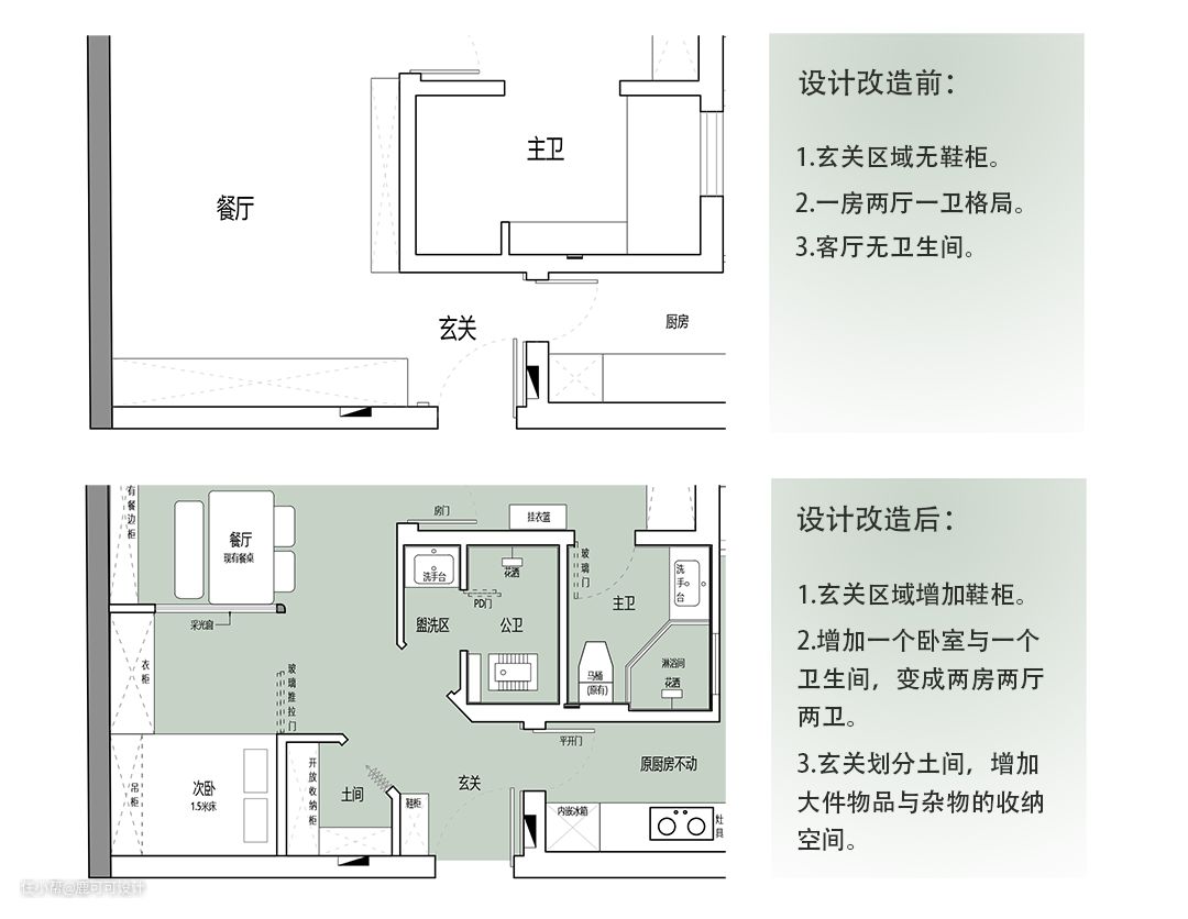 设计改造后: 在原餐厅位置增加了一个卧室 在玄关位置增加了土间 原洗手间划分成两个洗手间 封窗扩充室内空间