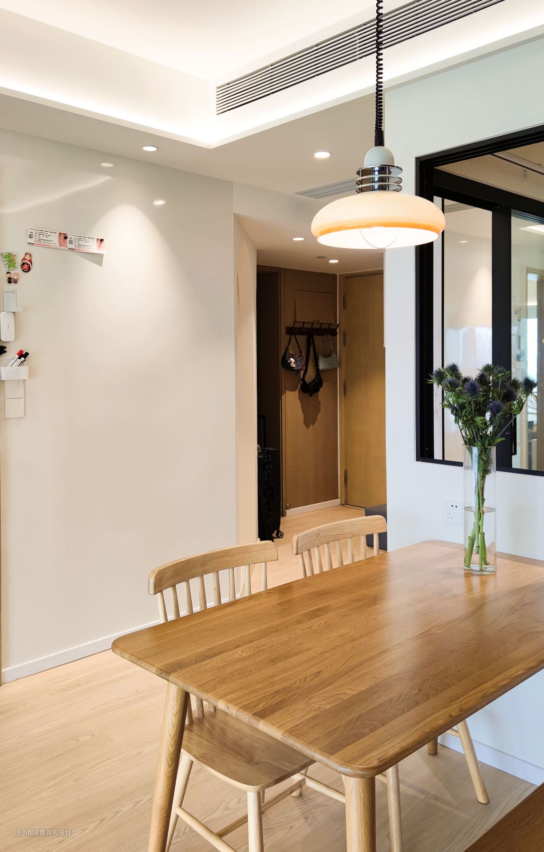 △餐桌后面的白墙可不止是白墙哦,还贴了珐琅板,可擦写,可磁吸。 △ 暖黄色的可伸缩吊灯太值得夸夸了,款式很适合餐厅,可伸缩功能更实用,她说做手工的时候往下一拉,可以照的很清楚,用完往上一推就行,灯光是三色可调的按需开就好。