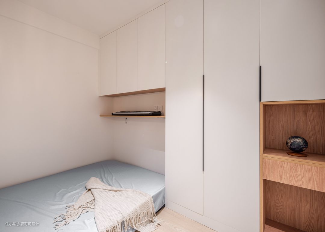 △ 主卧保留了床与拼接的小床,整个布局没有大变,床尾做了一整面墙的衣柜,把梳妆台隐藏在里面。 主要变动是主卫,原本家里就一个洗手间,洗手间进门位居然在主卧,就是说客人来了去洗手间必须先进来主卧,这是不合理的。我们把主卫改成了两个空间,一个主卫,一个公卫。