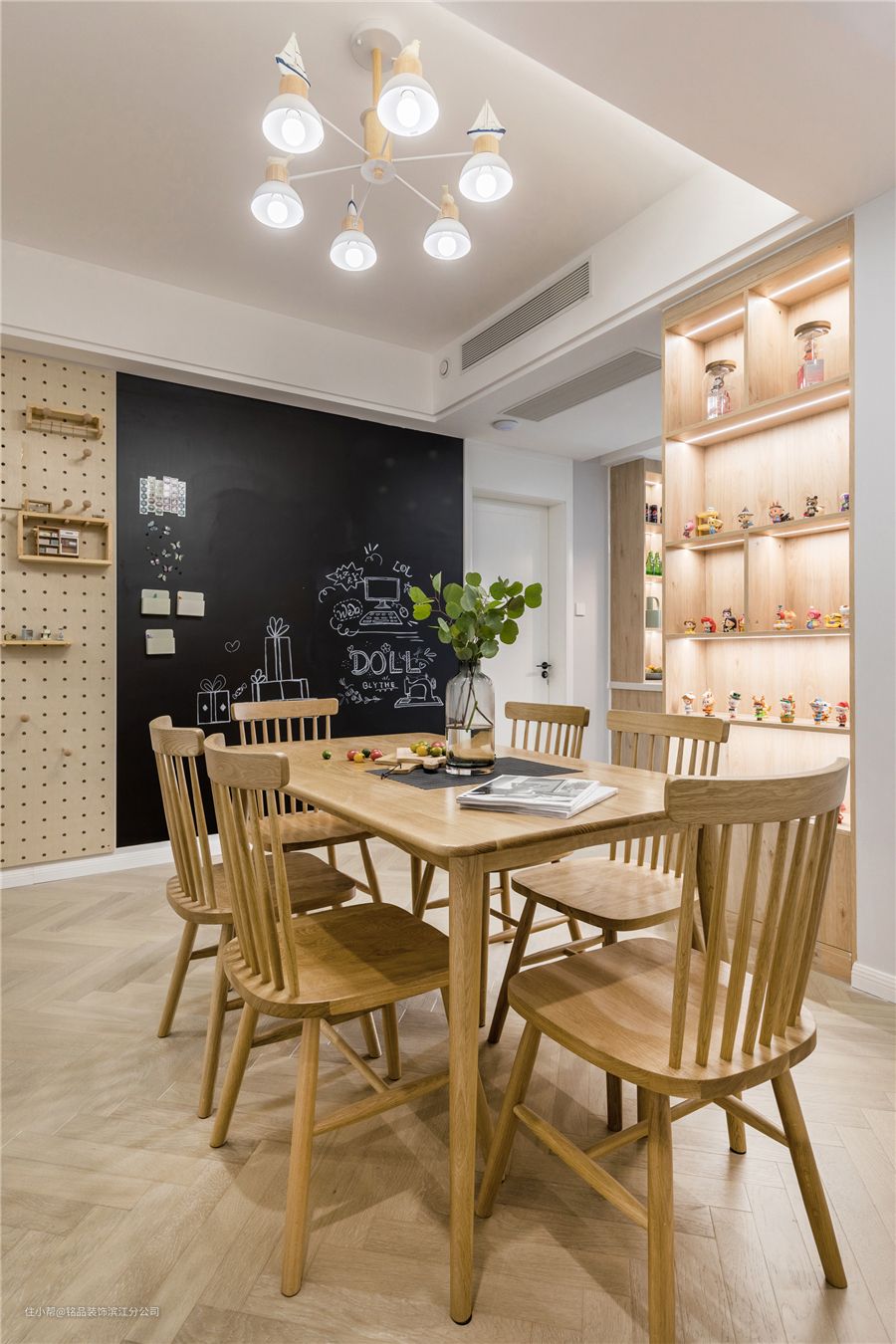 餐厅延续了客厅的整体设计格调和颜色,经过改造时候格局设计上都让业主很满意,一张2m左右的餐,最多可同时满足6-8人就餐,小家聚餐空间足够! 墙面通过黑板墙+洞洞板组合,让餐厅变得格外有趣! 洞洞板让墙面实用价值翻倍,可随意调节隔板空间和收纳位置,装饰实用两不误 黑板墙对于家里有娃的来说还是很有必要入手哦,大多数小朋友都喜欢乱涂乱画,这样刚好为孩子创造了个施展才艺的空间,温馨感十足哟~