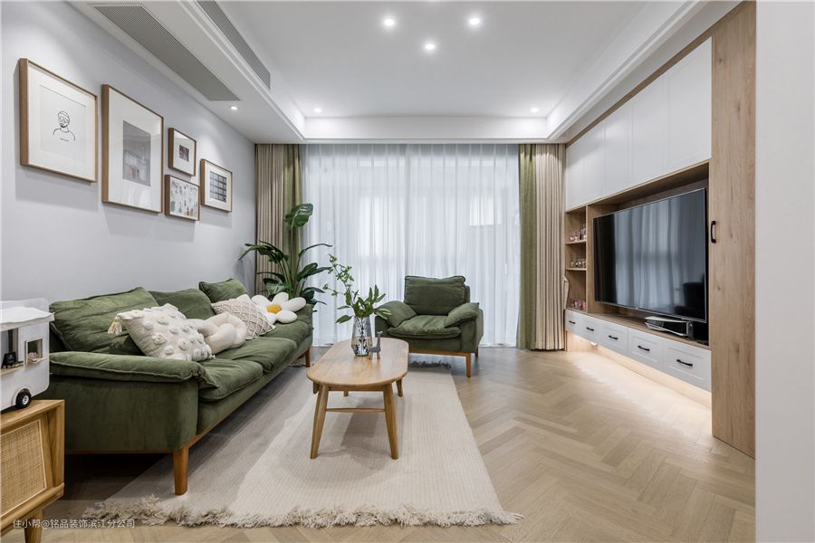 玄关看向客厅的全景图 业主希望公共区域是清爽简洁又不失实用价值的。现在地板就是原本精装修搞好的,并没有拆除。搭配地板颜色客厅墙面艺术留白设计,采用几幅装饰画点缀地中,整体空间更加耐看整洁了 客厅地面鱼骨拼地板,顶面是无主灯设计,每个角度都确保无照明死角 阳台包进室内,给空间拓容了不少,纯白色纱帘搭配果绿色和米色拼接的布艺窗帘,室内瞬间变得温柔了不少 整个电视墙空间以收纳实用性为主,但在收纳之余也将美观性考虑在内,虚实结合的橱柜储物设计,刚好给业主心爱的手办/盲盒找到了适合摆放的空间 保留了正面墙的空间,木工现场定制电视柜,构造简单的陈设与储物空间。电视柜底部悬浮设计内嵌灯带隐形照明,点亮空间层次感和灯光美观效果。另外底部增加了一排抽屉也很大程度上解决了公区的收纳需求