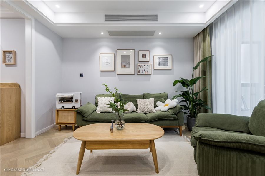 沙发背景墙灰白色墙漆涂刷在整面墙上,避免空间太过冷清业主自己在网购了几幅清新装饰画,不规则画饰强调了空间美感 青草绿布艺沙发,在几何构成的装饰画背景下,也是一大视觉美感冲击。北欧风满满的三人座沙发,自然浅色系马卡龙色调轻松缓解居住者在外一天的工作疲劳。米色沙发让空间多了一份温暖~