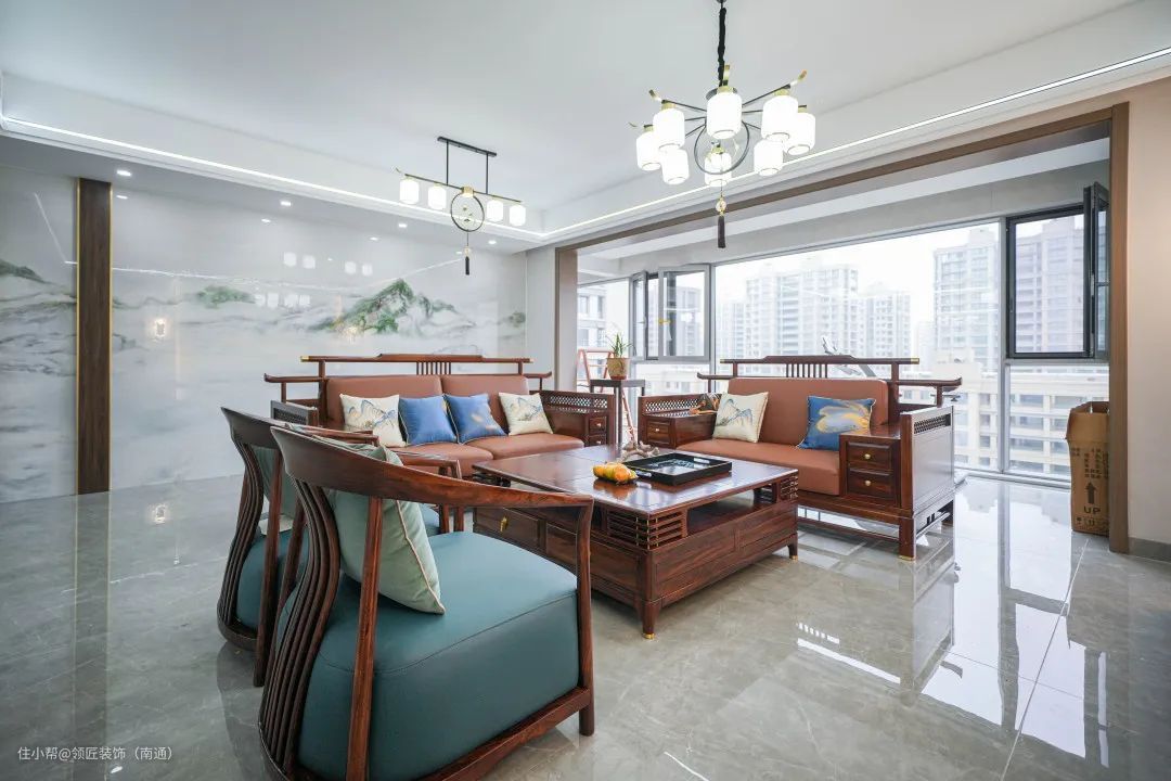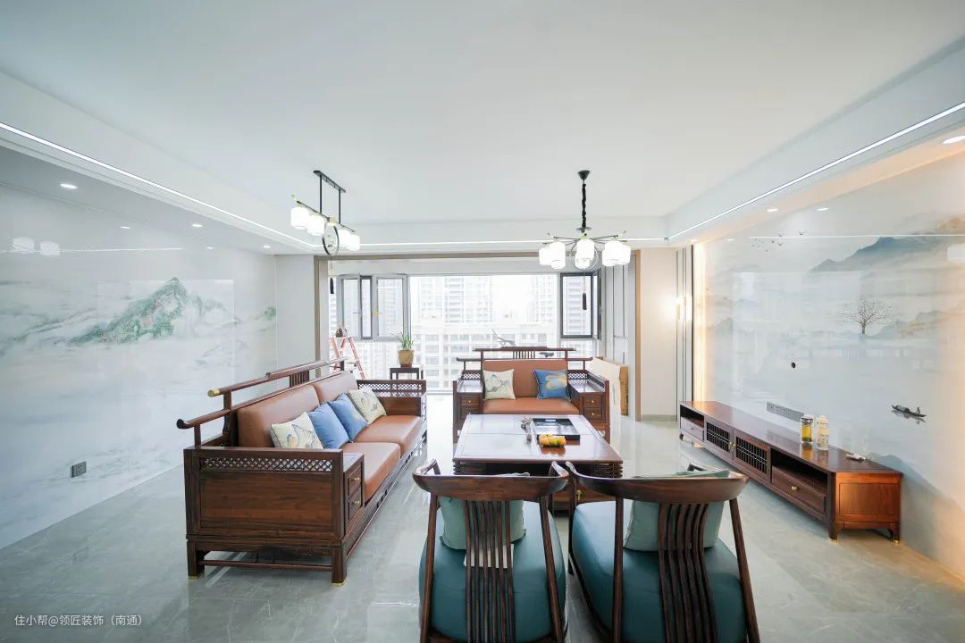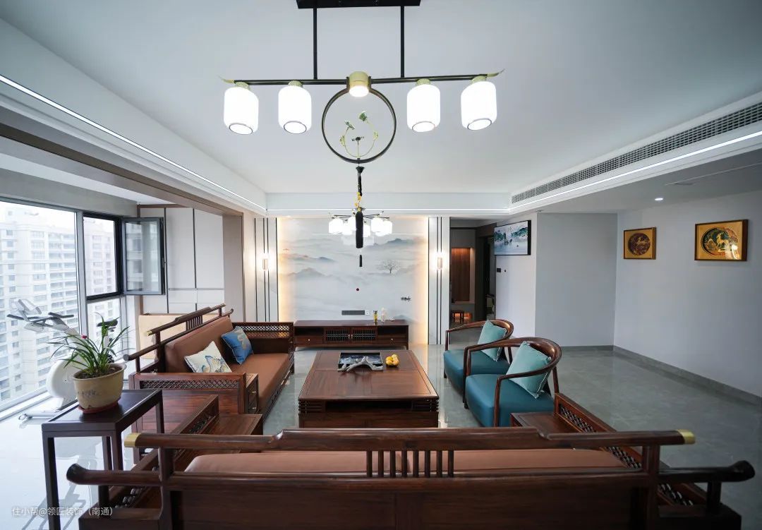 这是一套185㎡的新中式完工案例,设计师通过搭配大量木质家具装饰,赋予整个空间自然、质朴的氛围,打造出一处充满新中式风骨和现代时尚的雅居