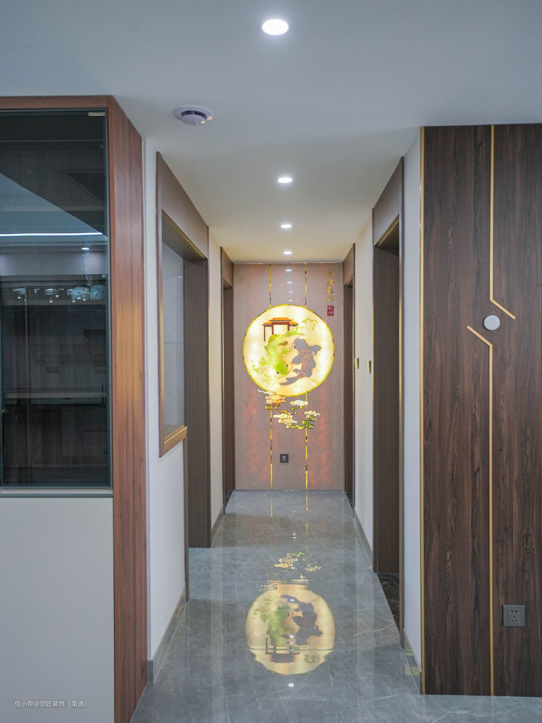 客厅整个空间宽敞大气,灰色抛光地砖,搭配错落有致的新中式实木家具,在现代与中式间维持着平衡,奠定了沉稳宁静的基调。 电视背景采用大理石材质的岩板,中式风格的壁灯左右对称,细节处加入了古铜的处理,延续中式古典设计的对称关系。 走廊以白墙为基础,尽头墙面加入中式圆形壁灯,意境深远,层次感强。