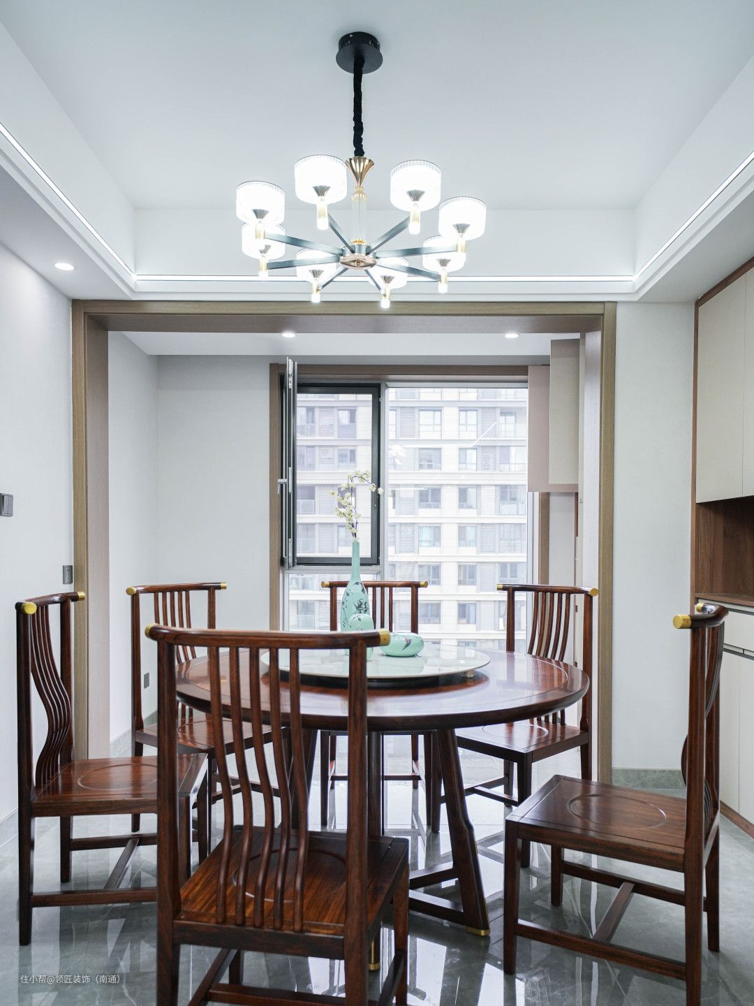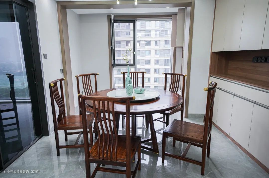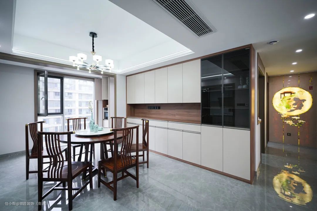 大气稳重的实木餐桌采用了石面元素,结合圆桌设计,更有“石来运转”之意。 天花上色泽亮丽金属质感的吊灯,营造出刚柔并济的就餐环境。 侧边打造一排现代化的餐边柜,不仅打破了传统中式对于餐厅空间的束缚,还提升了整体的收纳空间
