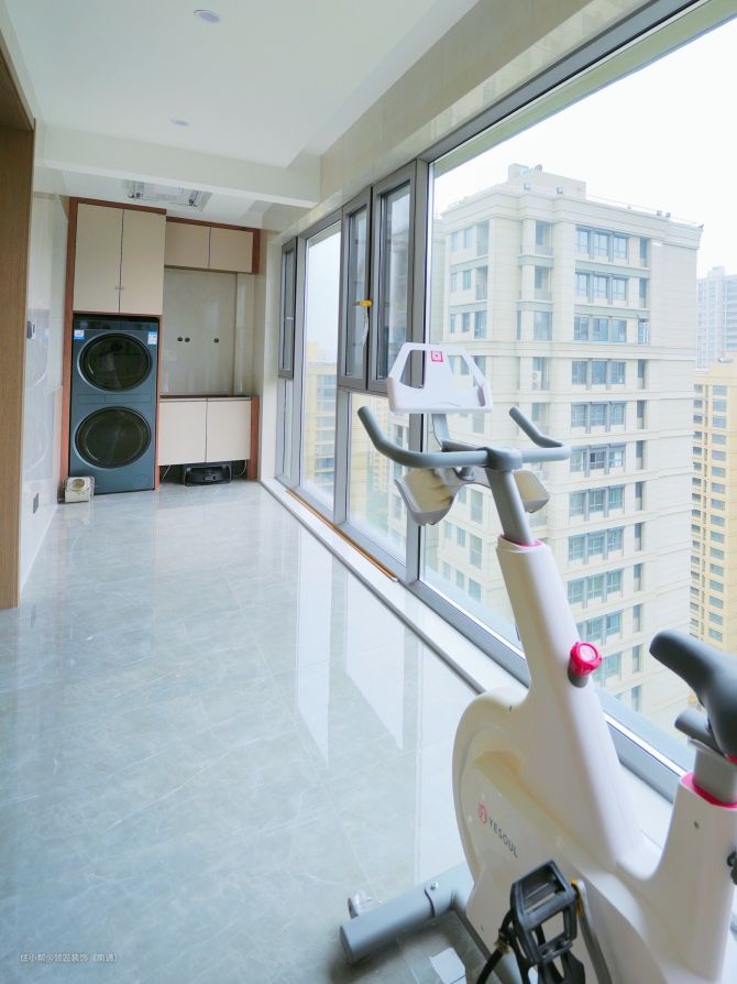阳台落地窗的采光使客厅的空间感加大。阳台一侧还做洗衣区,顶部设置隐藏式晾衣架,小小空间解决洗烘晒所有功能。