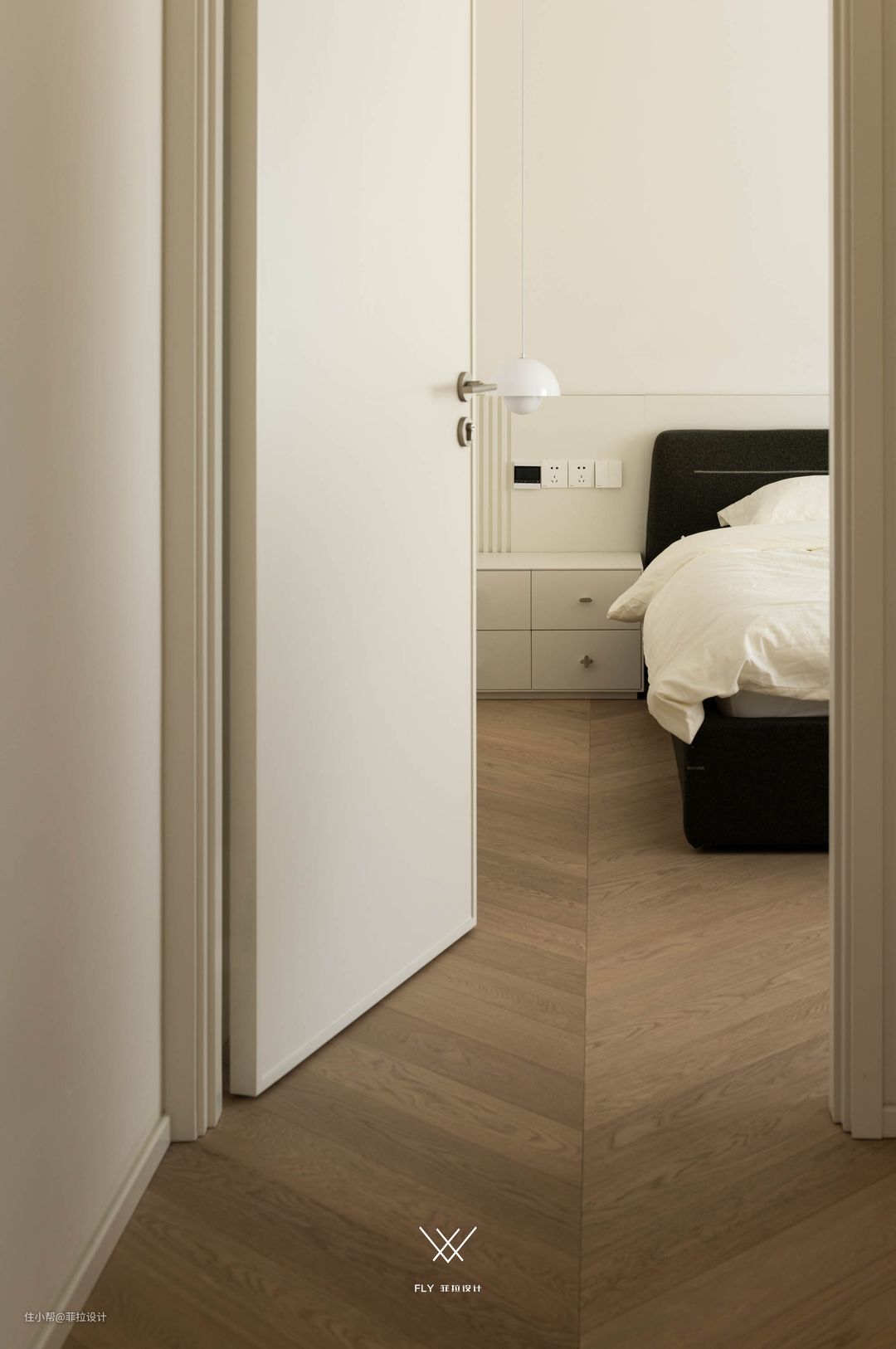 有序的线条完成了从公区到私密的衔接、蔓延,清雅的色调为空间描绘包容感,,让卧室里的一切都松弛自如。 #鱼骨拼#法式#卧室#卧室布局#床头柜 床头做了半高背景墙,两侧均点缀格栅装饰,纵向的条纹恰好能成为空间里的一抹调味剂,点亮空间的每一个角落。 #格栅#床头柜#卧室#插座#吊灯 保留飘窗,搭配浅灰色窗帘,色泽柔和,看起来万分舒心,让紧绷一天的神经逐渐放松下来。 #飘窗#窗帘#卧室#床头背景墙#床头柜 床尾打造悬浮式梳妆台,以穿插的形式延伸至飘窗上方,保持设计上的连贯呼应,小小的开放格避免挤压感,和谐的空间就这样渐渐呈现出来。 #飘窗#梳妆台#镜子#抽屉#收纳