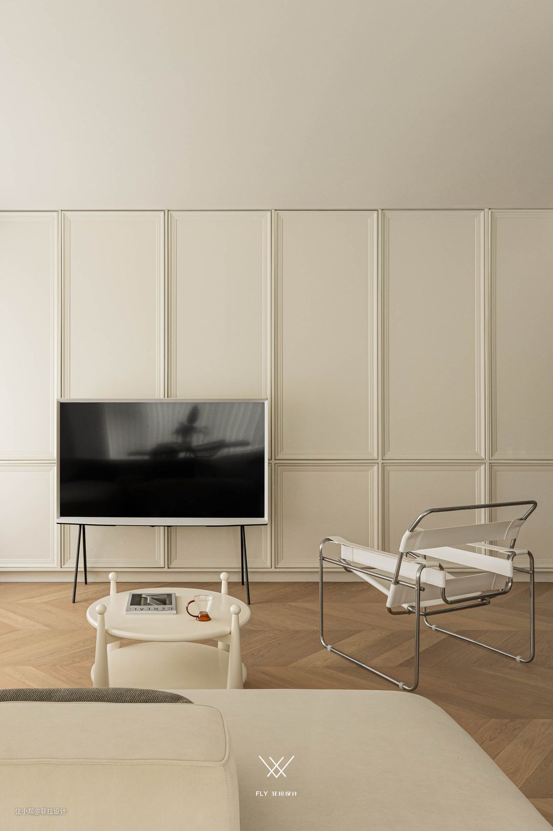 选择画境电视,将墙面空间完全释放出来,打造整墙收纳柜,上下组合的形式选择窄边框柜门,搭配免拉手设计,利落的线条勾勒出法式的优雅感。 #法式#鱼骨拼#电视柜#茶几#客厅