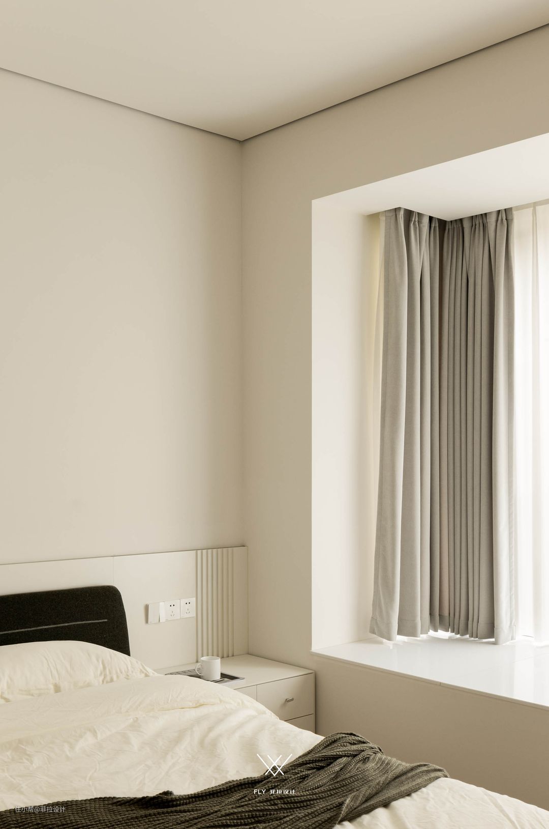 黑色的床具和鲜艳的装饰画从浅奶油的背景里跳跃出来,打破了空间的平淡乏味,每一处都彰显着居住者优雅的生活情调。 #卧室#床头背景墙#装饰画#飘窗