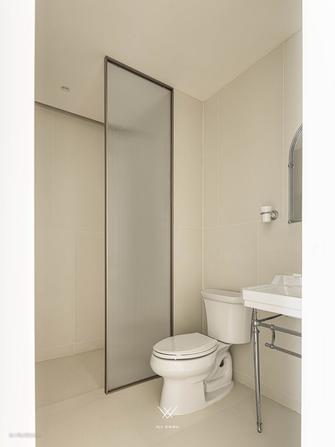 将主卫门洞调整至衣帽间一侧,超白长虹玻璃+黑色边框,展现时尚端庄的生活质感。主卫内部干湿分离,淋浴区位于最外侧,通风良好,干区采用双台盆+悬浮柜,避免水汽,方便打理。 #卫生间#双台盆#洗手台#镜柜 客卫位于客卧一侧,内推之后将内部空间一分为二,采用玻璃移门分隔干区和湿区,墙顶地色调一致,提升空间精致度。 #干湿分离#洗手台#马桶#淋浴区